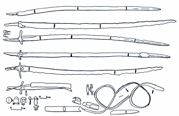3. Погребения с конем, взнузданным и оседланным, с пикой либо копьем, саблей, остатками лука, стрел, колчанов и налучей, набором защитного снаряжения (кольчуги, шлемы).