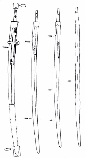 Основа ножен сабель изготавливалась из двух тонких деревянных планок, повторяющих контур клинка. Деревянная основа могла обтягиваться тонкой кожей или тканью. С учетом особой любви половцев к красному цвету, что прослеживается на археологическом материале, можно предположить, что и обтяжка ножен, в большинстве случаев имела этот цвет. Металлические детали ножен, если они входили в гарнитур, как правило, представляли собой погонные кольца (в количестве двух штук), закрепленные на узких обоймах, повторяющих контур клинка и наконечник ножен, имеющий прямоугольную форму. Исключение из правил, пожалуй, составляет гарнитур сабельных ножен, происходящий из погребения близь Юрьева-Польского, где в его состав входили многочисленные обоймы, равномерно располагающиеся по всей длине клинка. Нередко под обоймы подкладывались узкие металлические пластины, проходящие по верхней части ножен.