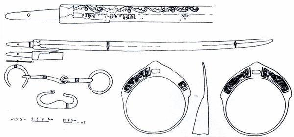 | Орнаментированные и подписные клинки сабель | Нежин. Сабля и ее клеймо, удила, кресало, стремена из погребения | Сабли из погребений Цемдолинского могильника |