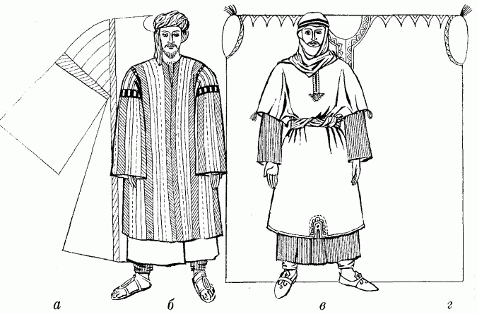 | Мал. 2 Чоловічий верхній одяг. Арабський Схід. VII—XVI ст.: а) схема крою то джебби; б) джебба, одягнена поверх сорочки; і хаїк, одягнений поверх сорочки; г) схема крою хаїка. Рис. 2 Верхние мужские одежды. Арабский Восток. VII—XVI вв. |