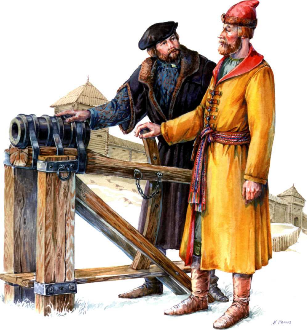 Документы, сообщая названия разных видов огнестрельного оружия: пушки, пищали, тюфяки, ручницы, – не называют людей, использовавших и обслуживавших эту важнейшую часть арсенала Великого князя. Попытаться ответить на поставленный вопрос помогает сообщение московского посла в Италии Георгия Перкамота, продиктовавшего в 1486 г. в канцелярии миланского герцога Сфорца сообщение о России. Представляя при миланском дворе Великого князя московского, Г. Перкамот утверждал, что «после того как немцы совсем недавно ввезли к ним самострел и мушкет, сыновья дворян освоили их так, что арбалеты, самострелы и мушкеты введены там и широко применяются»7. Получается, что дети боярские, т.е. поместная конница, и иностранные мастера-оружейники — первая «обслуга» огнестрельного оружия московского войска.