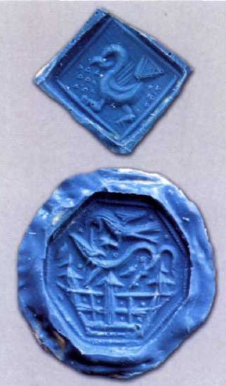 Изображения, близкие представленному, известны на прикладных восковых печатях, на новгородских печатях21, а также на тверских печатях и монетах XV-XVI вв. Они встречаются и на болгарских золотых перстнях XIV в. с владельческими надписями вокруг изображения птицы. На наш взгляд, русские перстни с подобным сюжетом – это те же самые владельческие перстни, но отражающие довольно высокое общественное положение их владельцев.