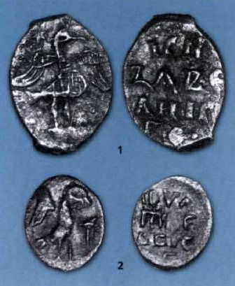 Наиболее интересные в контексте этой сюжетики перстни имеют на щитке (обычно овальной формы) изображение фигуры стоящего, либо идущего воина-копьеносца (ил. 1). В принципе изображение Святого воина с копьем появляется в княжеской сфрагистике еще в начале XII в.9 Примером может служить печать, принадлежавшая новгородскому князю Всеволоду – Гавриилу Мстиславичу-Феодоровичу (1117-1136 гг.). На ее лицевой стороне помещено изображение Благовещения с «испуганной Марией»: архангел с жезлом в руках и Мария с пряжей, сидящая на скамье. На обратной стороне помещено изображение Св. Федора в полный рост с копьем в правой руке и со щитом, опущенным вниз, в левой. На печатях новгородских посадников XIV-XV вв. часто встречается вооруженный копьем всадник10. Однако перстни из калужских находок типологически относятся к более позднему времени (скорее всего, к XVI - началу XVII вв.). Поэтому вопрос об их генетической связи с отмеченной ранней символикой пока остается открытым.