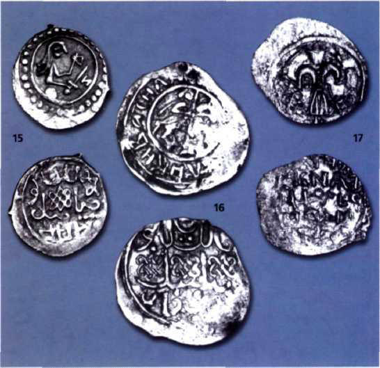 Сходство изображений на перстнях-печатках и русских монетах XIV - начала XVI вв. очень примечательно и характерно. Так, сюжеты воина с топором и мечом (ил. 15) и воина на коне с мечом (ил. 16) можно увидеть на монетах великого князя Василия Дмитриевича (1389-1425 гг.). Изображение воина с мечом и щитом (ил. 17) встречается на монетах князя галичского Юрия Дмитриевича (1389-1434 гг.), а также на монетах Тверского княжества6, но чаще всего этот сюжет встречается на монетах князя Бориса Александровича (1425-1461 гг.). Из 30 типов монет этого князя изображение воина со щитом и мечом присутствует на 6 типах, относящихся к середине и второй половине его правления7. Это явно сближает монетную символику с образом Святого воина, традиционно воспроизводимого на свинцовых княжеских печатях XП-XV вв.8