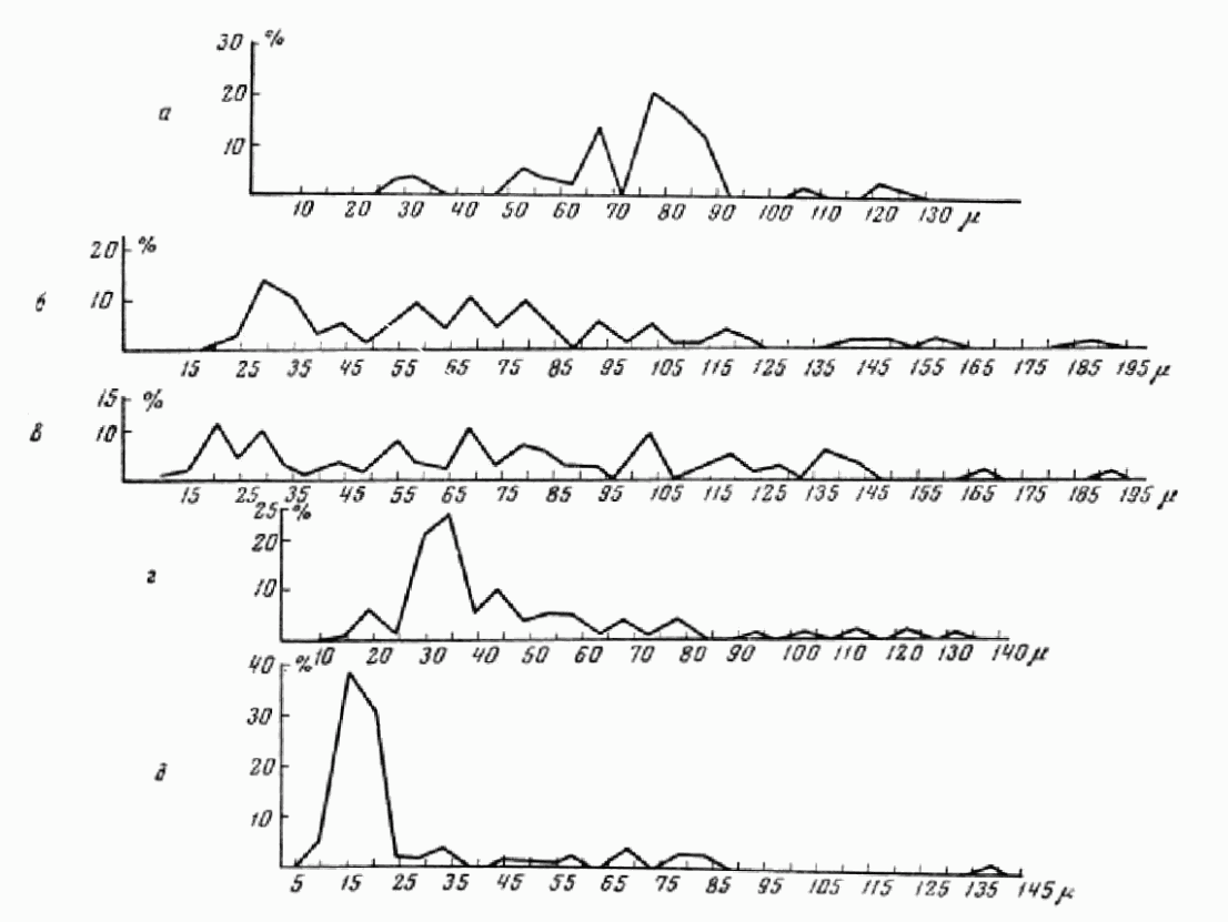 | Рис. 1. Кривые толщин шерсти вязаных изделий а — Н-58/2860, ярус 20; б — Н-57/4645, ярус 11; в — Н-55/10105, ярус 16/17; г — Н-52/11040, ярус 13; д — Н-57/4662, ярус 15/16 |