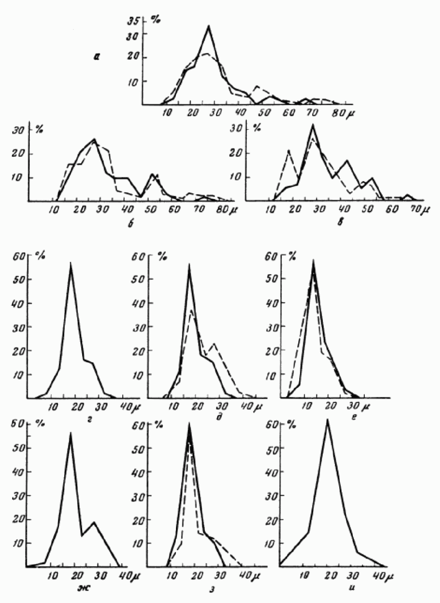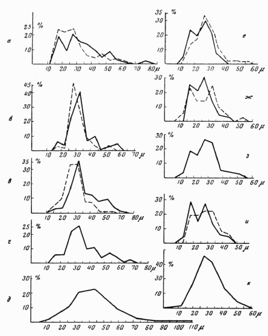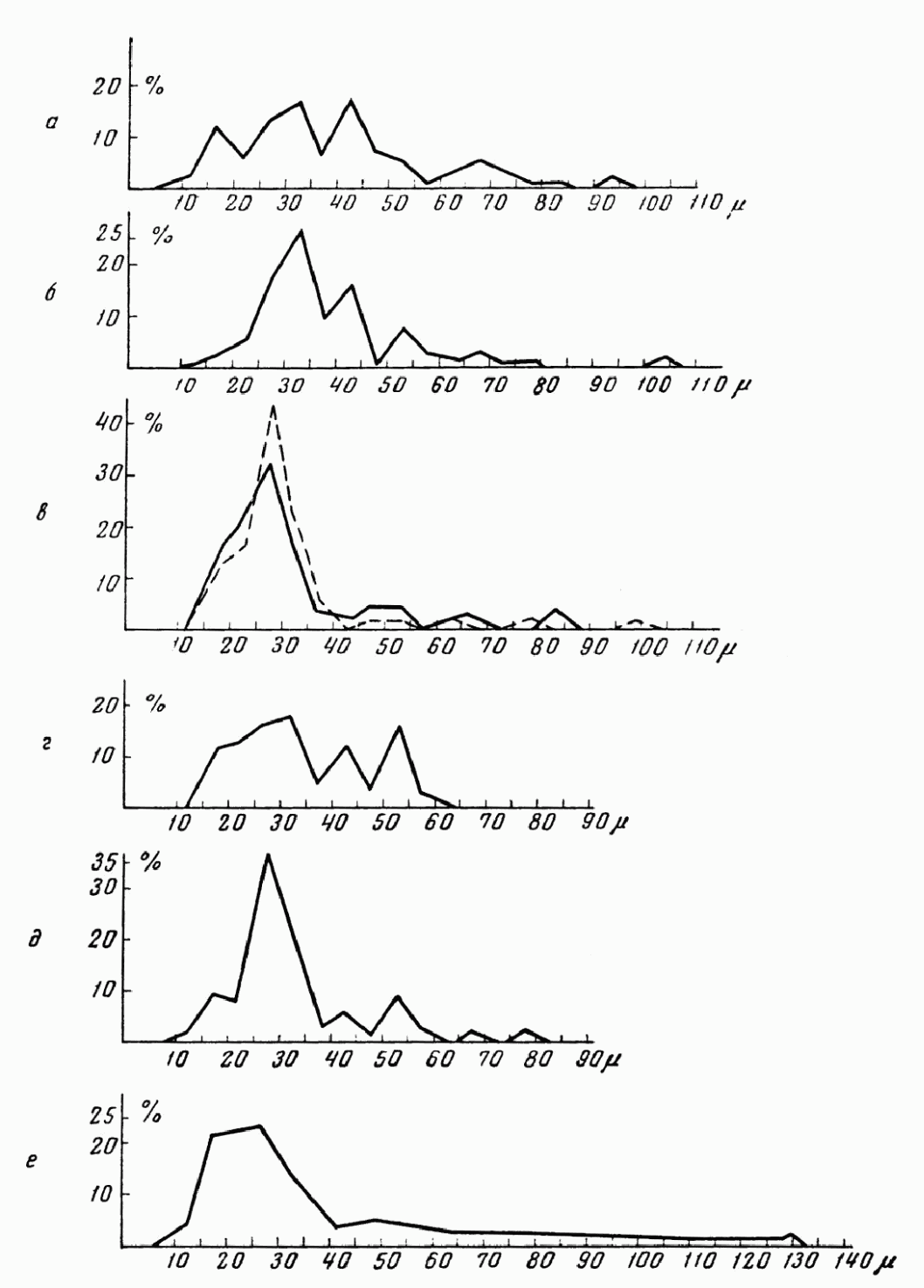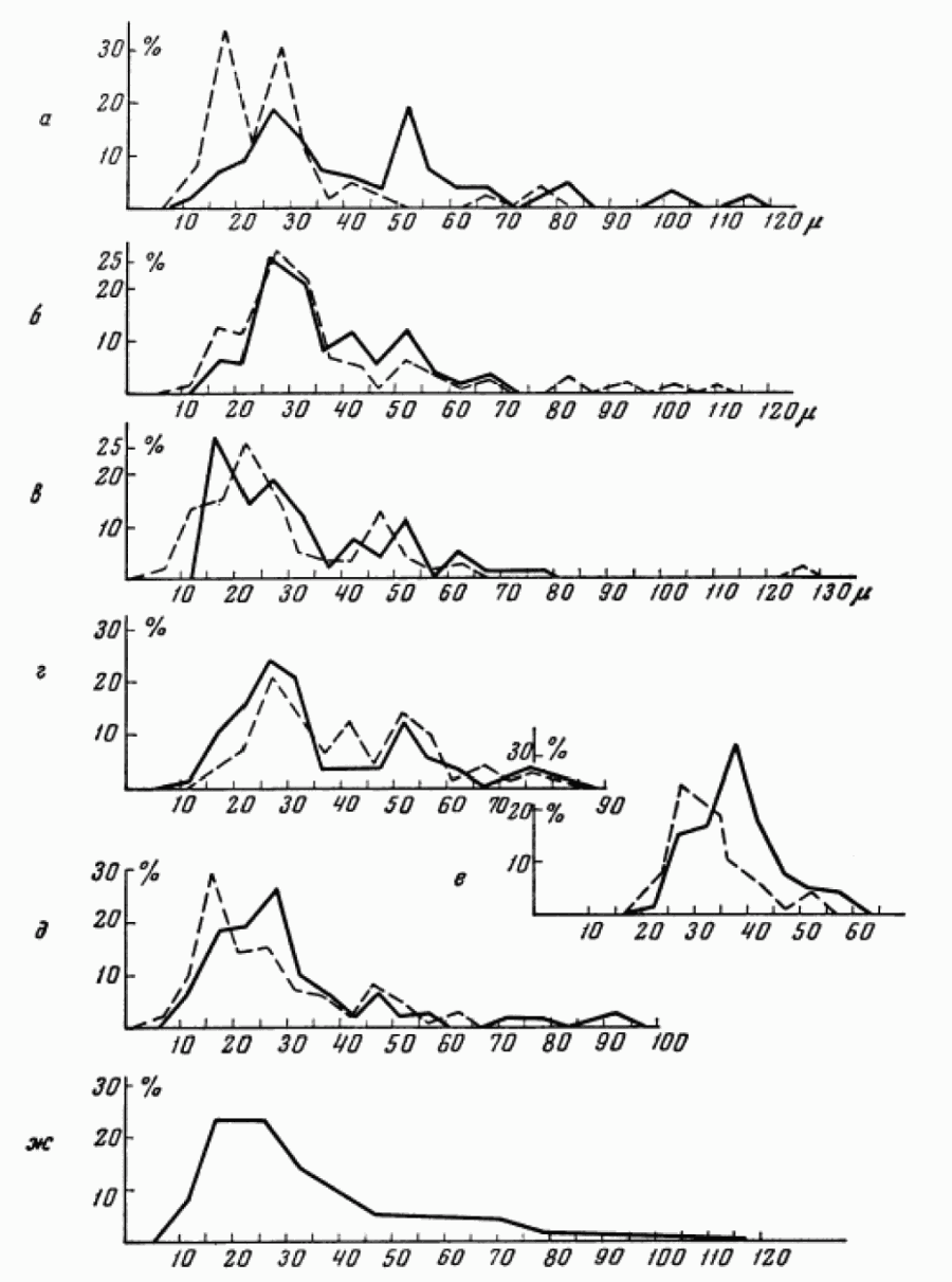 К этой группе относится и ткань Н-55/10150, ярус 13/14, изготовленная из шерсти, которая в основе имеет толщину 14—37 мк, средняя толщина 21 мк, неравномерность толщины 23%, в утке 10—37 мк, средняя толщина 19 мк, неравномерность толщины — 28%, причем и в основе, и в утке основную массу составляют пуховые волокна, переходных волокон очень мало, остевых нет совсем. В хорошо сохранившихся фрагментах можно видеть кольцеобразные чешуйки. На рис. 6 представлены кривые толщин суконных валяных и крашенных тканей Н-57/10112, ярус 10, Н-57/4694, ярус 5/6 и Н-54/4177, ярус 10/11, которые вполне соответствуют двум описанным выше; все эти примеры крашеных валяных и неваляных тканей, которые мы дальше будем называть сукнами, представляют наилучшую шерсть среди текстильных находок Новгорода. Но среди суконных тканей как валяных, так и неваляных, встречаются ткани, имеющие более толстую шерсть. Возможно, эта часть является сукном местного производства, как предполагает Н. Б. Черных15. В качестве примера можно привести данные анализа шерсти двух тканей. Н-54/4180, ярус 5/6 (рис. 5, а) представляет собой красное сукно со следами сваливания, основа которого изготовлена из шерсти толщиной 14-73 мк, средняя толщина 30 мк. Пуховые и переходные волокна толщиной до 34 мк являются наиболее ровными и образуют 79% общей массы. Неравномерность шерсти 44%. Толщина утка колеблется между 17 и 77 мк, средняя толщина 36 мк, наибольшее количество пуховых и переходных волокон (76%) имеет толщину не более 39 мк. Изредка попадается остевое волокно толщиной 51 мк. Сходный характер сырья имеют следующие находки: Н-57/4640, ярус 7 и Н-57/4618, ярус 4/5. Диаграммы толщин шерсти этих тканей представлены на рис. 5, б и е.