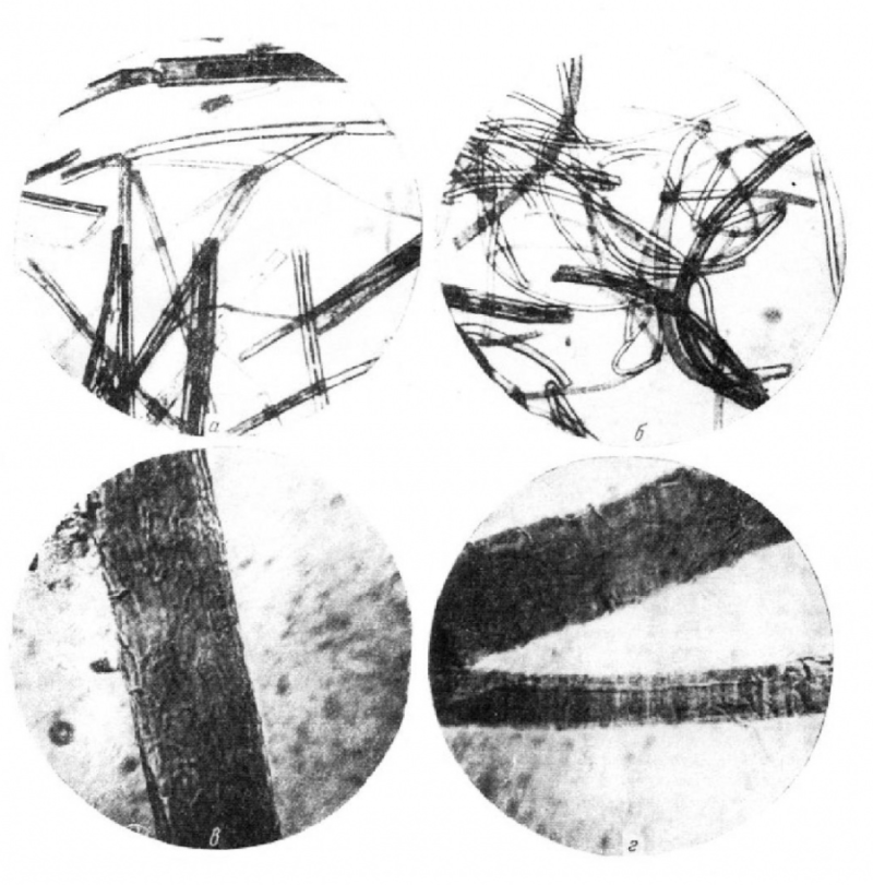 Ажурная ткань Н-55/10189, 14 ярус (рис. 2, а) имеет толщину волокна 9—100 мк при средней толщине 40 мк. Пуховые волокна достигают 34 мк, переходные — 51 мк, а самые тонкие остевые волокна не превышают 34 мк, их процентное содержание равняется 37%. Неравномерность толщины составляет 47%. Микроснимки волокон шерсти и приведены на рис. 3.