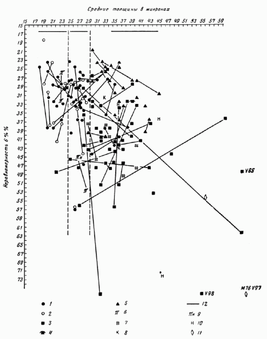 На оси ординат этой диаграммы мы откладываем среднюю толщину исследуемых проб (в микронах), а на оси абсцисс — процентную неравномерность толщины. В зависимости от сохранности находки у одних тканей мы брали пробы от утка и основы отдельно, а у других вместе, смешанно. В связи с этим на схеме данные анализа тканей, в который основа и уток исследовались отдельно, соединены прямой линией, остальные данные нанесены в виде отдельно стоящих значков. Каждая группа тканей обозначена соответствующим значком. Эта диаграмма показывает, что параметры шерсти отдельных типов тканей образуют в основном замкнутые, с небольшой разбросанностью группы.