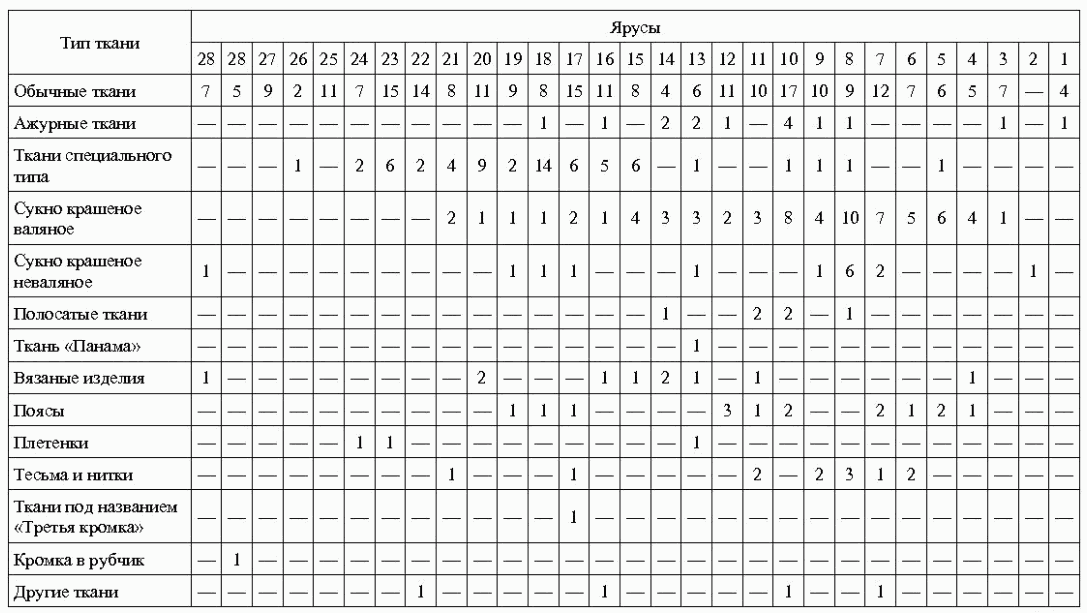 Ниже мы приводим табл. 1, показывающую общее соотношение отдельных типов текстильных находок, обнаруженных в Новгороде и являющихся предметов настоящего исследования.