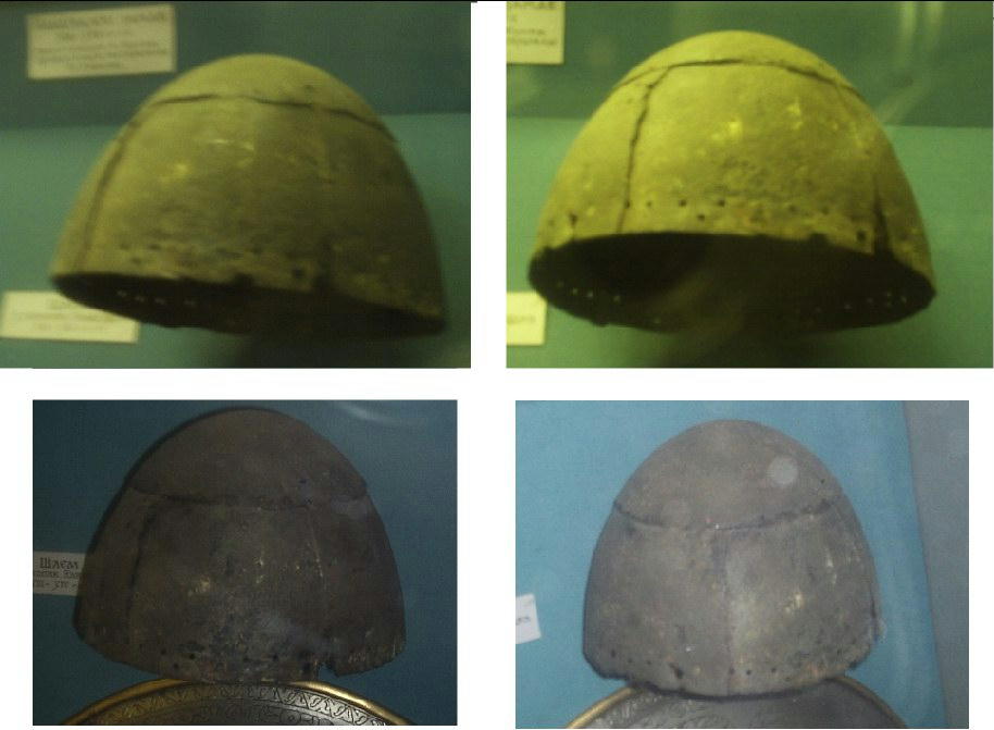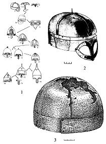 Шлем из Посильно по форме колокола может быть отнесен к коническим нагаловя14 (рис. 1:1). Для нас он интересен не своей формой, а тем, что колокол состоит из четырех боковых пластин, которые сверху скрепленные крестообразной пластиной (пластинами?), А снизу - обручем. Очень близок к нему по технологии изготовления шлем с Дурбе Дир, который также имеет звон стажковай формы, сделанный из пяти пластин - четырех боковых и одной крестообразной, что скрепляет их зверху15. Снизу шлем скрепленный обручем (рис. 1:2), который спереди имеет своеобразный выступление (возможно выступление имитирует наносником (?), Но назвать его собственно наносником трудно). Могильник Дурбе Дир связывают с последствиями битвы при Дурбе в 1260 г.16 К этой же группе следует отнести и шлем с кладбища Павирвитэ-Гуда. Его колокол также сделан с крестообразной верхней и четырех боковых пластин (имеет среднее между конической и полусферической формой). Снизу колокол скреплен обручем, который спереди расширяется и приобретает форму треугольного козырька. На макушке колокола было бронзовое крестообразно украшение (рис. 1:3)17. Все три описанные боевые наголовья не имеют, к сожалению, узкого датирования. Только шлем с Павирвитэ-Гуда был датирован В. Казакявичусам 11 в., А вся группа, как можно понять, датавалася 11-12 ст.18