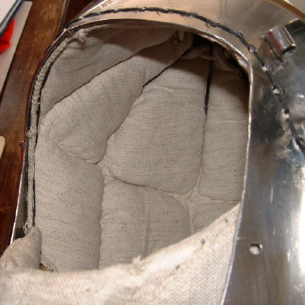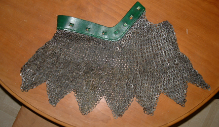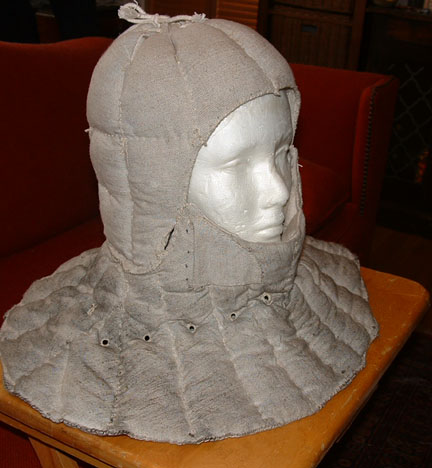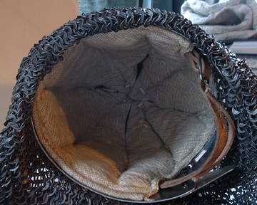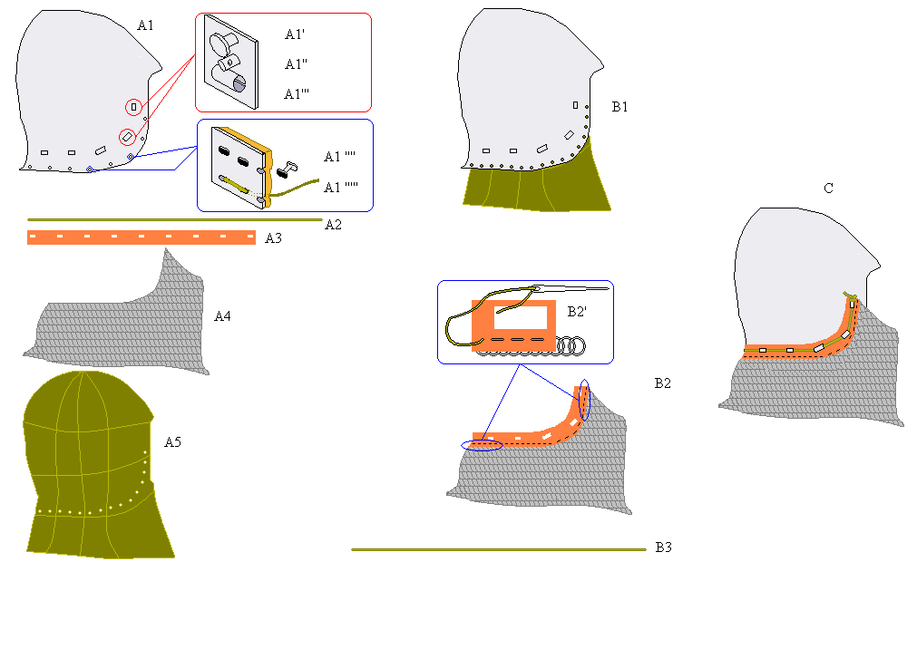 A5 - Подшлемник.  Незашитый верх тульи подшлемника позволяет при помощи шнурков регулировать подшлемник под конкретную голову.  В общем, подкладка под бармицу и бармица начинается у подбородка и закрывает шею и большую часть плеч, как шапка-капюшон.