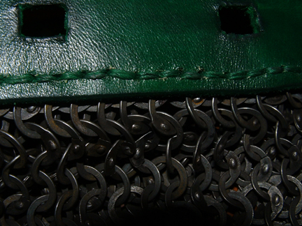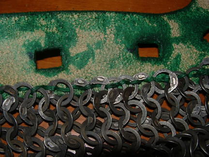 Данный метод крепления применялся с древних времен и просуществовал до конца эпохи применения доспехов повсюду от Пиренейского полуострова до Уральских Гор. Но в начале 14 века Европа переходит в основном на крепления через вервелы, а Русь и восток применяют другие способы крепления бармицы. Если вы хотите применить этот метод, то вам  сначала необходимо просверлить отверстия. Для этого готовую кольчужную бармицу и приложите её к небольшой металлической полоске и разметьте отметьте места будующих отверстий:  от края — половина внутреннего диаметра кольца, а между отверстиями — чуть меньше полного внутреннего диаметра кольца. Просверлите в полоске отверстия, теперь у вас есть шаблон для разметки отверстий под бармицу. Приложите этот шаблон к шлему разметьте фломастером или чертилкой, не помешает и накернить. Сверлить отверстия для бармицы рекомендуется на станке, надежно зафиксировав шлем.