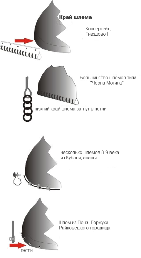 Этот способ можно назвать "Ординарные петли, прикрепленные к нижнему краю тульи". В петли и крючки продевается проволока на которую крепилась кольчужная бармица.