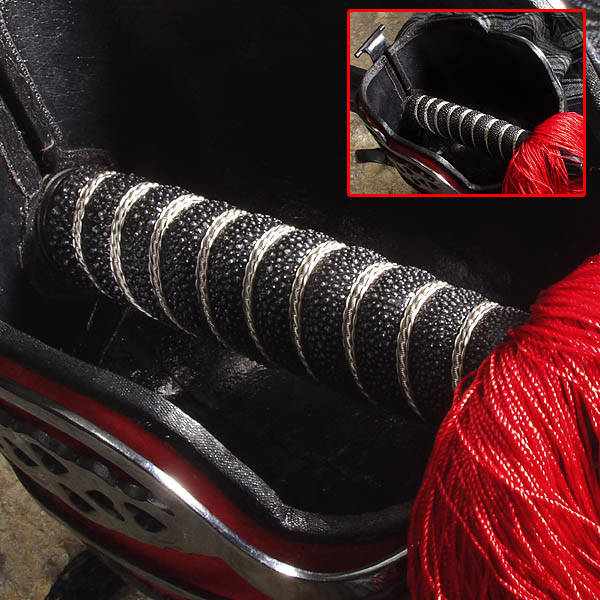Рукоять с широкой вороненой корзиной, сделан из вороненой стали, хвостовик покрыт деревом и лучшей декоративно завернутой кожей.