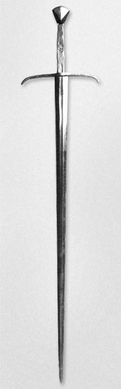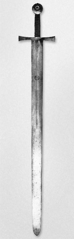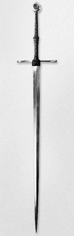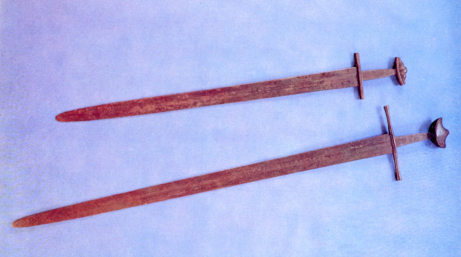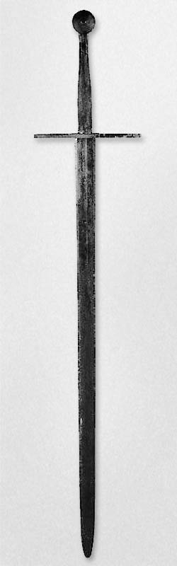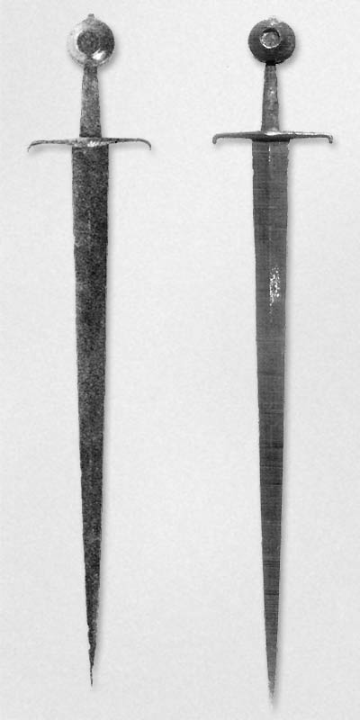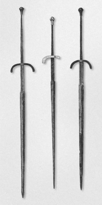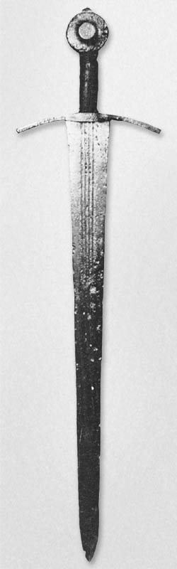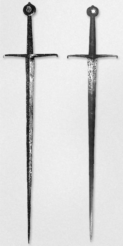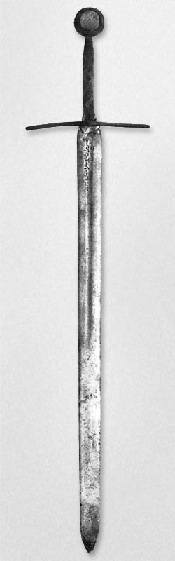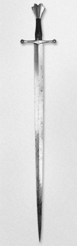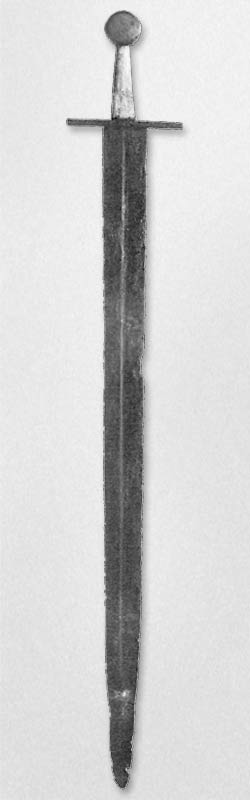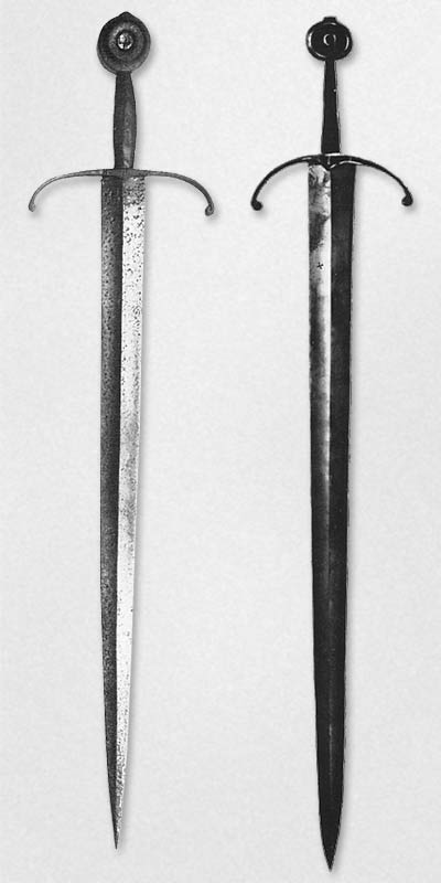 Другой датский вариант, с очень длинным черенком рукояти. Это военные мечи конца 15-го века. Имеют грушевидное навершие и короткие концы крестовины закругленные по направлению к клинку.