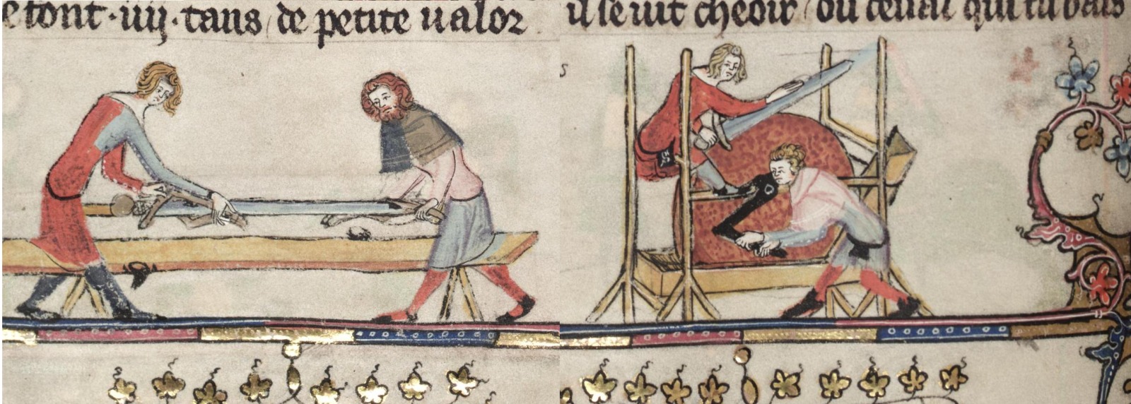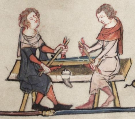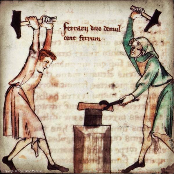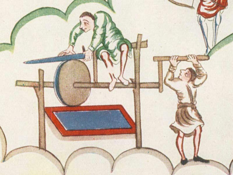 | Процесс шлифования из Кентерберийского Псалтыря, около 1150 | Крейг Джонсон производит шлифование клинка | Разогревание клинка в кузне Крейга Джонсона |