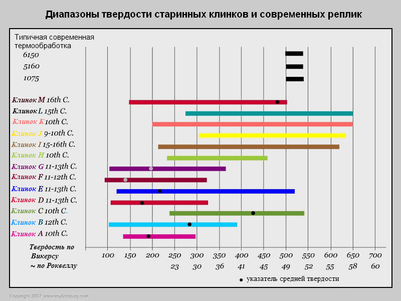 Этот график подробно показывает диапазоны твердости у нескольких средневековых клинков по сравнению с современными репликами, сделанными из маркированных сталей. Имейте в виду, что диапазон включает в себя все точки проверенные на мече, поэтому верхние и нижние номера могут обозначать только одну точку на клинке а не изменение от лезвия к середине клинка. Точка была применена чтобы указать где тестеры вычисляют среднюю твердость клика.