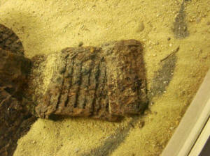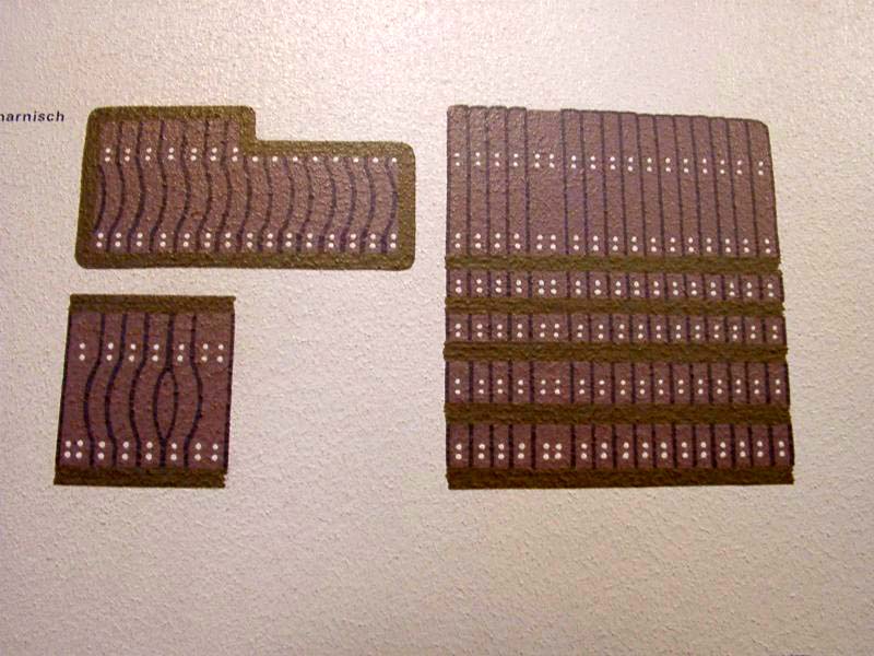 | Рис. 4 (фото). Отдельная изогнутая деталь панциря, набранная из пластин второго типа (железо) | Рис. 5 (фото). Монолит из скрепленных веерообразно пластин шестого типа (железо) |
