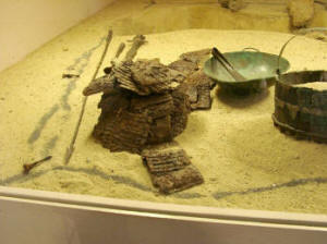 Кроме двух упомянутых выше амфор здесь найдены: кусочки золототканой одежды или покрова; два золотых листочка от гроба или погребального венка; золотой гвоздик; маленький золотой полумесяц, прикреплявшийся к чему-то тремя золотыми гвоздиками; золотые с тисненым орнаментом концы пояса или застежки, мелкие серебряные обломки, четыре бусины и медная, византийская монета императора Льва (457-473 гг.); обломки из бронзы, кости и стекла. Из погребального инвентаря также уцелели два железных кинжала, около двух десятков железных наконечников стрел, два железных меча (один из них с остатками кожи от деревянных ножен), круглое брон- зовое зеркало и такая же круглая на трех ножках подставка под лампу, два железных шлема (один в обломках, другой цельный с прикипевшей к нему и загнувшейся внутрь железной бармицей), железный наконечник копья, большое количество панцирных пла- стин, наплечников и других деталей доспе- ха. Немногочисленные, разрозненные и сильно истлевшие кости, найденные в ката- комбе, не позволили установить количество погребенных. По-видимому, в каждой ката- комбе было погребено по несколько человек [Отчет…, 1893. С. 59-61].