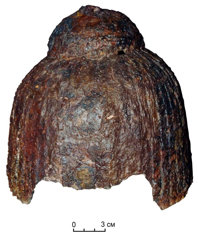 Реставрация шлемов к настоящему времени еще не завершена. Тем не менее уже сегодня можно говорить о ряде конструктивных отличий шлемов из погребения по сравнению с опубликованной В. Арендом реконструкцией. Наиболее сохранившийся шлем был набран из порядка 50 достаточно длинных (17-18 см) фигурных пластин, половина из которых были направлены налево, другая половина – направо (см. рис. 3). Имелись также навершие и налобная пластина. В связи с этим необходимо отметить, что до завершения полной научной реставрации шлемов какие-либо выводы представляются преждевременными. Среди некоторых, уже упомянутых нами аналогий керченским шлемам следует указать и на находку близ с. Ильичевка [Николаева 1986. С. 183-188. Рис. 1,1].