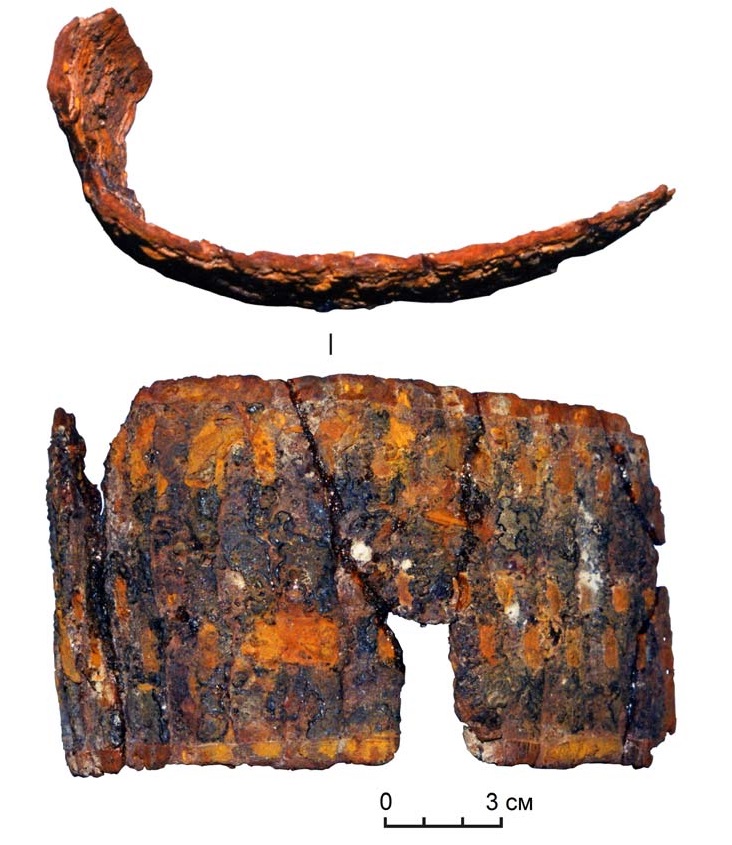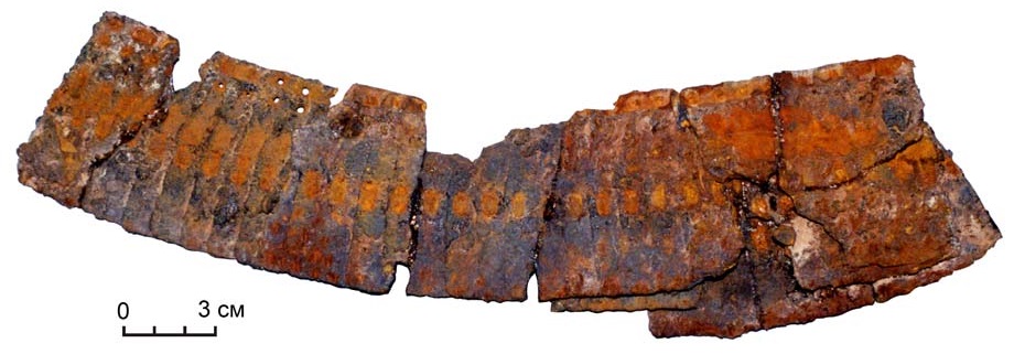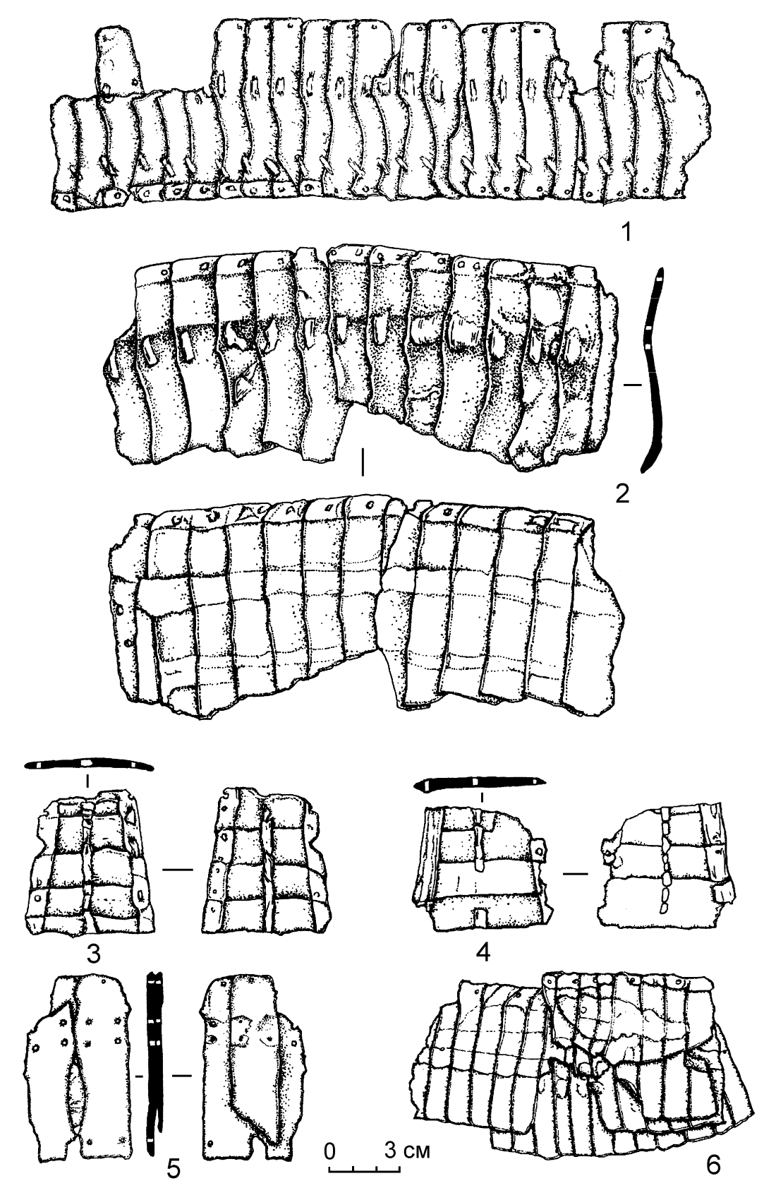 Пластины шестого типа скреплялись веерообразно, за верхние отверстия. Как следствие, у ряда из пластин этого типа кожаная окантовка имеется только сверху. В результате реставрационных работ удалось склеить небольшой монолит из 3 рядов, свернутых «гармошкой» (рис. 2, 6, 5). Длина первого ряда составила 31 см и не является окончательной. Установлено, что почти все типы пластин (I, II, IV-VI) имеют разнонаправленные вырезы. Полосы пластин одних и тех же типов скреплялись между собой вырезами в одну сторону. В центре панциря между собой эти полосы скреплялись таким образом, чтобы вырезы пластин были направлены друг на друга. Эти полосы скрепляла одна прямая пластина, которая подкладывалась под них (рис. 2, 5). От доспеха сохранились две небольшие детали, также набранные из пластин (рис. 2, 3, 4). Их назначение еще предстоит установить.