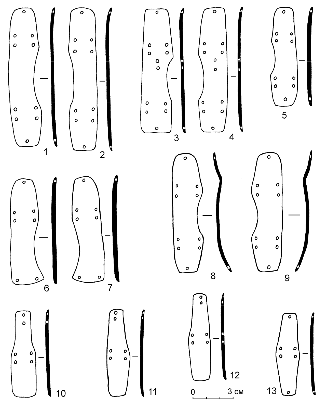 Тип VII. Пластины ромбической формы (рис. 1, 13). Размеры: длина – 6,2 см, максимальная ширина – 1,8, толщина – 0,2 см. Снабжены 6 отверстиями.