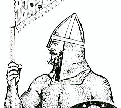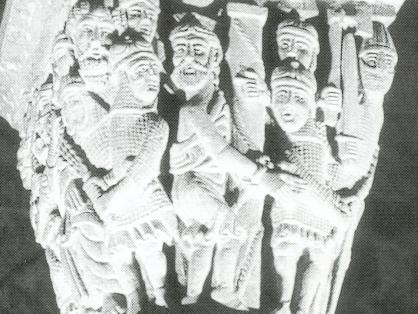 | (H) Прорисовка испанского рыцаря на иллюстрации в кодексе из монастыря Санто-Доминго де Силос (Село) в Бургосе (Bild in einem Kodex aus dem Kloster von Santo Domingo von Silos (Selos) bei Burgos ) 1091-1109 год. Британская библиотека, Add. Ms 11695 | (E2) Колонна в церкви Святого Нектария (Kirche St. Nectaire) на юге Франции, конец 11-го нач. 12-го века. У рыцарей сно видно кольчуга у шлема не составляет единого целого с остальной кольчугой. Отдельный интерес вызывает одежда виднеющаяся из под кольчуг |