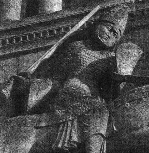 | (I7) Нотр-Дам-дю-Порт, Клермон-Ферран, Франция (Notre Dame du Port, Clermont-Ferrand) середина 12-го века. Эта скульптура несколько поздняя, но она очень ясно показывает пример спущенного кольчужного лицевого клапана и закрытого (не кольчугой) лица. Щит крайне редкой сердцеобразной фрмы. |