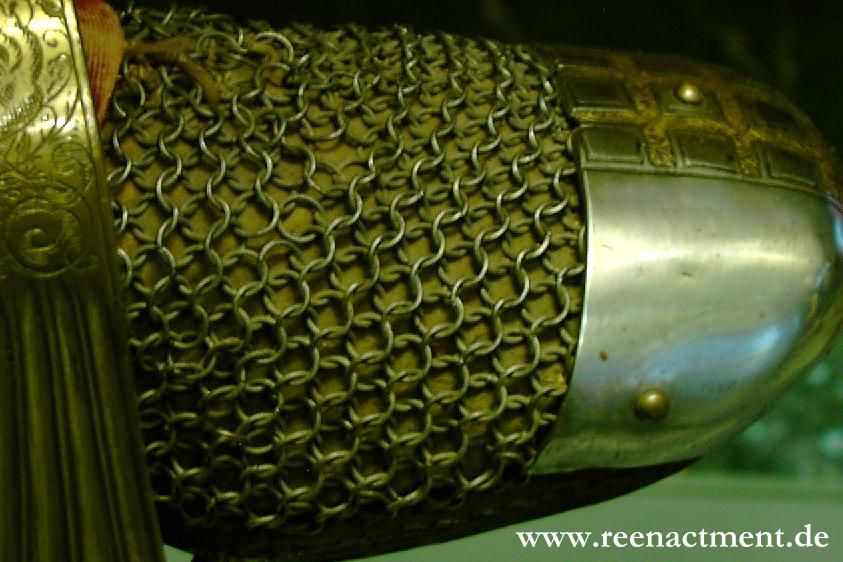Боковая щель для ножен меча появляется во второй половине 11-го века и встречается до середины 12 века у кольчуг. Из неё заметен меч рукояткой торчащий из этой щели, наконечник ножен часто при этом выглядывает снизу из под кольчуги. На Гобелене из Байе, (см. рис. D). мы видим каким образом носился меч также очень интересна фигра в Хильдесхаймском соборе (нем. Hildesheimer Dom) см. рис. К, "Избиение младенцев" (см. рис. I3) и посмотрите на фасад собора в Ангулеме (нем. Kathedrale von Angouleme) на рис. U. Более ранних данных о ношении меча под кольчугой не мне не известно.