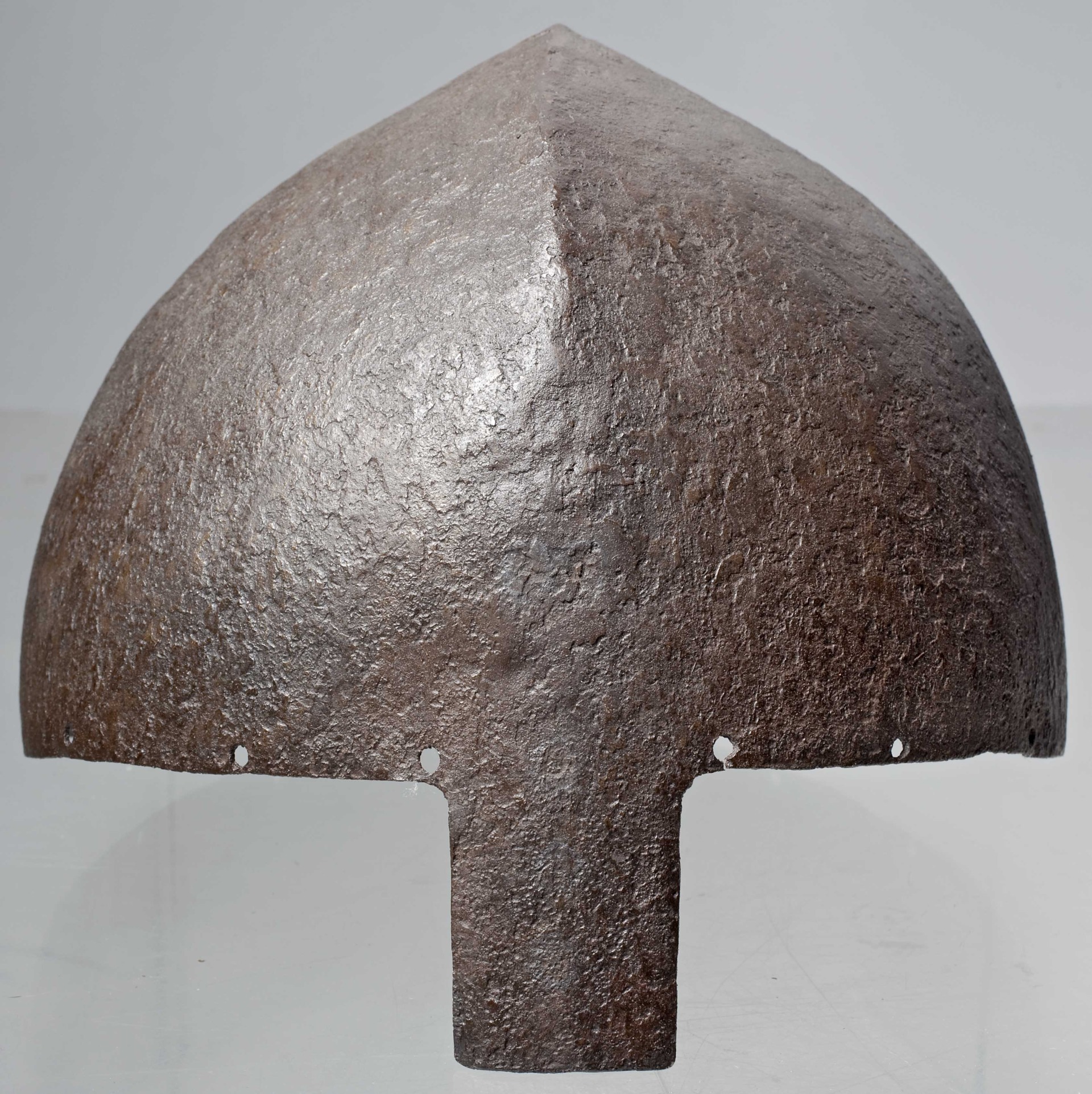 | (R) шлем-черепник из Ниредеальты, кантон Граубюнден, Швейцария. (Kalottenhelm Niederrealta Graubünden, Schweiz) Железный, 11/12. век. "шлем с полусферический куполом, который выкован из единого куска. Железный венец прикреплен к верхнему и нижнему краям, каждый с рядом конических шипов 63 и 64, между двойными диапазоне длин волн от небольших отверстий. Венец и шипы покрыты оловом. "(7). Очевидно, что наносника не было. |