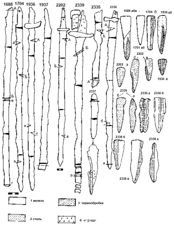 Клинки трех сабель (№ № 1688, 1936, 2337) выкованы по технологии вварки стального лезвия. Сабля № 1688 состояла из двух однолезвийных фрагментов, поэтому для доказательства их принадлежности одному клинку были исследованы оба конца каждого фрагмента (А, Б, В, Г). Структурная схема всех шлифов идентичная, что является доказательством их принадлежности одной сабли. Ее клинок был выкован по всей длине с двух полос металла - железа и малоуглеродистой стали. Микротвердость феррита - 160-181 кг/мм2, феррито-перлита с содержанием углерода 0.2% - 193-206 кг/мм2. Качество ковки и сварки очень высокое, об этом свидетельствуют мелкозернистость структуры и отсутствие шлаковых включений. В лезвие была вварена полоса высокоуглеродистой стали. В зоне вложение стальной полосы есть большая шлаковое включения. Клинок был резко закален и отпущен (высокий отпуск), на остриях фиксируется структура сорбита отпуска и трооститу с микротвердостью 274-383 кг/мм2.