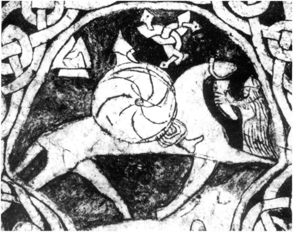 Фрагмент поминального камня с острова Гэтланд с изображением всадника  Пряжка (М 1:1) и наконечник поясного ремня, орнаментированные в стиле Борре