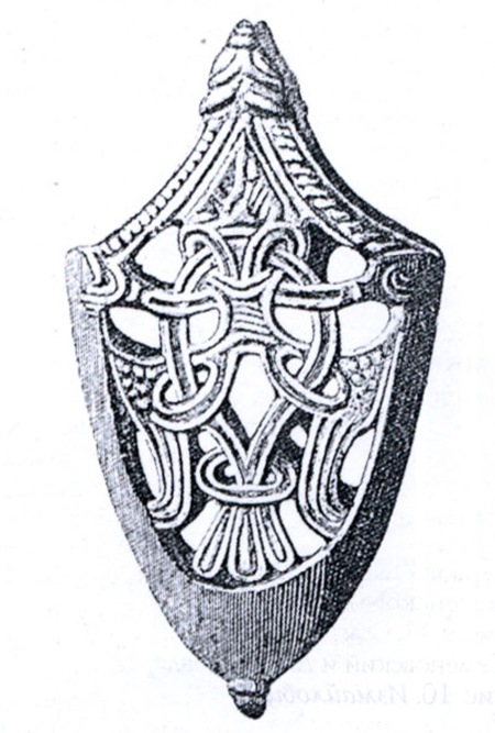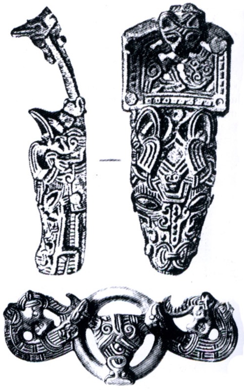 Рукоять меча, украшенная бронзовыми орнаментированными накладками в стиле Борре Наконечник ножен меча с изображением птицы в стиле Борре (М 1:1)  Бляшка, послужившая прототипом при реконструкции копейного флажка (М 1:1)