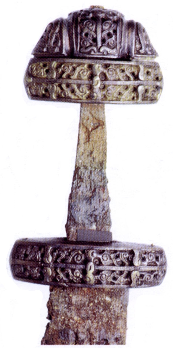 Иногда нижний конец ножен снабжался бронзовым ажурным наконечником. В X -первой половине XI веков на территории Древней Руси были распространены наконечники с изображением дракона или птицы. Ножны меча на нашей реконструкции украшает наконечник широко распространенного в Скандинавии типа; на территории Руси подобные наконечники найдены в Гнёздово, Новгороде и на городище Крутик.
