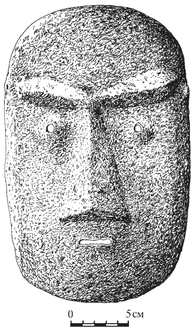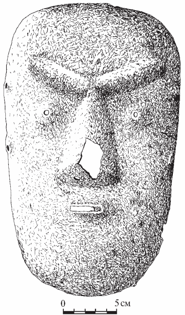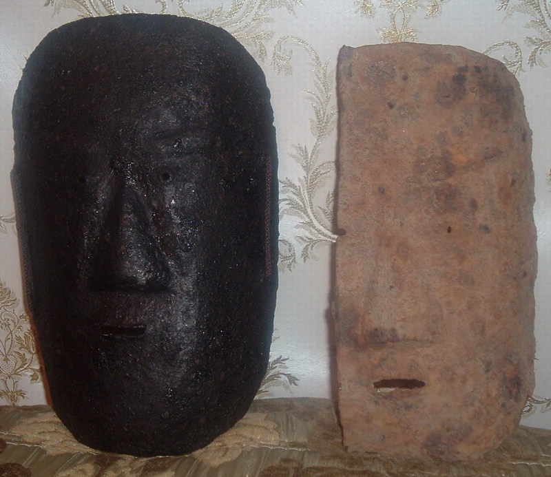 К настоящему времени в Приморье известны несколько железных масок. Обнаружены они на средневековых городищах, относящихся к началу XIII в. (периоду государства Восточное Ся). Во время раскопок центральных ворот Шайгинского городища в 1982 г. была обнаружена первая из них (рис. 2). По мнению В.Э. Шавкунова, маска изготовлена методом кузнечной ковки, возможно, на болванке, из цельного листа железа (Шавкунов В.Э., 1993, с. 80). Она имеет выпуклую форму и, судя по всему, плотно прилегала к лицу Толщина железного листа, из которого изготовлена маска, составляет 0,2 см. Длина маски 23 см, ширина – 15,5 см. Выпуклые и массивные брови сходятся под углом к переносице. Длина левой брови 7,2 см, правой – 6,9 см. Диаметр отверстий для глаз 5 мм (левое) и 6 мм (правое). Расстояние между центрами отверстий для глаз 6,5 см. Нос прямой, подтреугольной формы, длиной 7,2 см, шириной у основания – 5,3 см. Высота по центру его основания – 1,8 см. В основании носа сделаны два круглых отверстия (ноздри) диаметром 5 мм. Расстояние между ними – 11 мм. Рот сделан в виде прорези прямоугольной формы длиной 2,5 см, шириной – 0,6 см. По бокам маски имеются парные отверстия для креплений диаметром 0,6 см, расстояние между ними 6,5 см. Вес маски 470 гр.