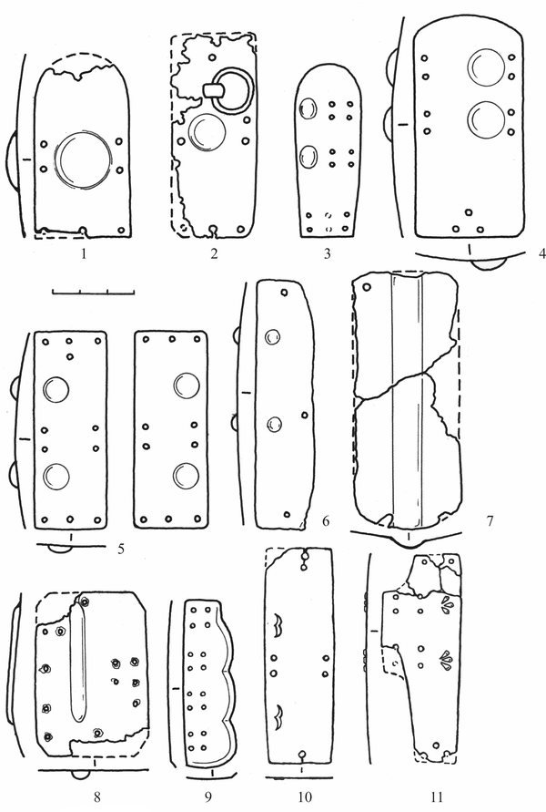 Исследователи древнерусского вооружения давно обратили внимание на тиснёную отделку доспешных пластинок. Так, А.Ф. Медведев отмечал наличие "полушарных выпуклостей” на пластинках X-XII вв. из Донецкого городища (Харьковская область, Украина) и пластинках XI-XII вв. из Новгорода Великого, но не комментировал их наличие. А.Н. Кирпичников справедливо отметил, что "некоторые пластинки, видимо, для большей прочности снабжены небольшими выпуклостями. На сегодняшний день на территории Киевской Руси всего зафиксировано 12 образцов пластинок от ламеллярных и чешуйчатых доспехов с различного рода тиснением (Рис. 1), как одиночных, так и в скоплениях. Разнохарактерность тиснения позволяет предполагать, что путём дополнительной обработки пластинок мастера-бронники стремились не только повысить степень прочности непосредственно самих пластинок, но и добиться ещё ряда целей. Приведённый автором статьи материал почерпнут из опубликованных, общедоступных источников. При работе над статьёй был также применён метод историко-археологического моделирования.