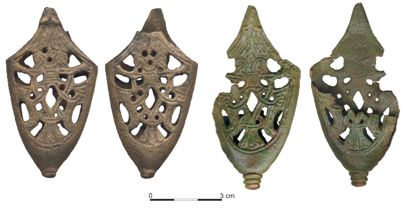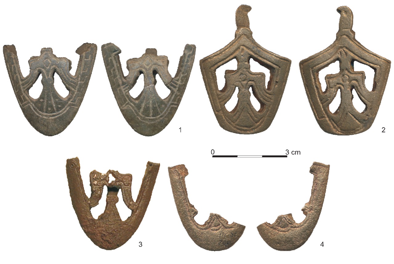 Из Гнёздова происходят два экземпляра наконечников с мотивом совмещённых фигур человека и птицы (№№ 11-12 в Каталоге; рис. 8:1-2, фото 4:1-2). Первый найден при раскопках западной части селища в пахотном слое, что делает невозможной его хронологическую локализацию. Наконечник сохранился почти полностью, отсутствует верхняя часть рамки одной из сторон (рис. 8:1, фото 4:1). Отличительная черта данного наконечника – нечёткий, «замытый» рельеф, что позволяет предположить его изготовление по оттиску без дальнейшей проработки орнамента14.