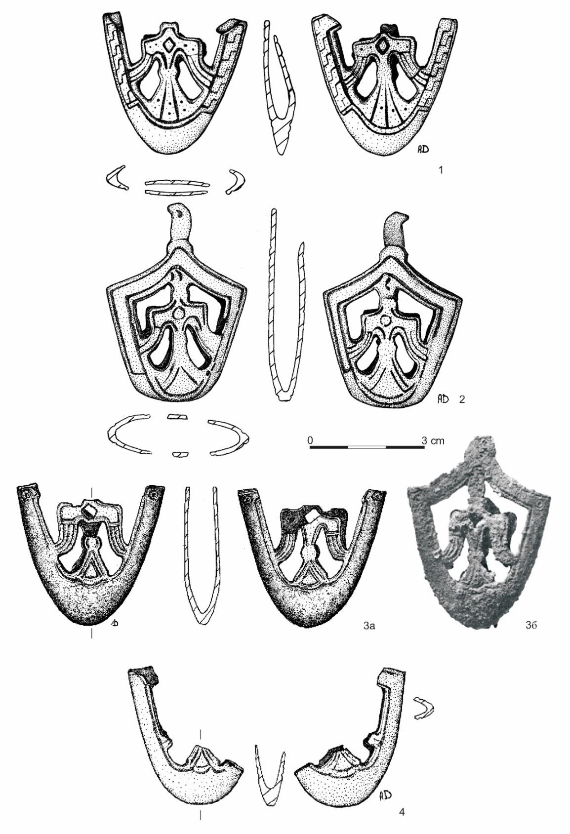 Fig. 4. Sword chapes, type Gn.-I.1. 1 - No. 1 (in Catalogue of sword’s chapes); 2 - No. 2; 3 - No. 4 (3a - current condition of artefact’s preservation, 36 - chape after discovering - after Cusoe 1902, ma6n. VIII:5); 4 - No. 3.