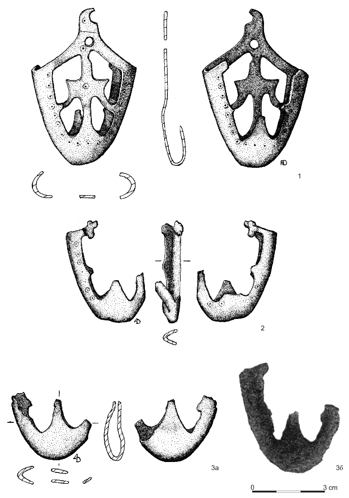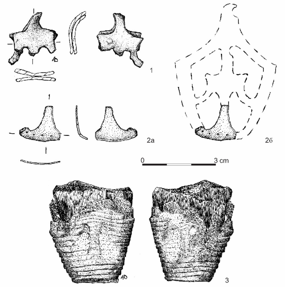 Fig. 5. Sword chapes, type Gn.-I.2. 1 - No. 10; 2 - No. 5; 3 - No. 8 (3а - current condition of artefact’s preservation, 36 - chape after discovering - after Спицын 1905, рис. 118).