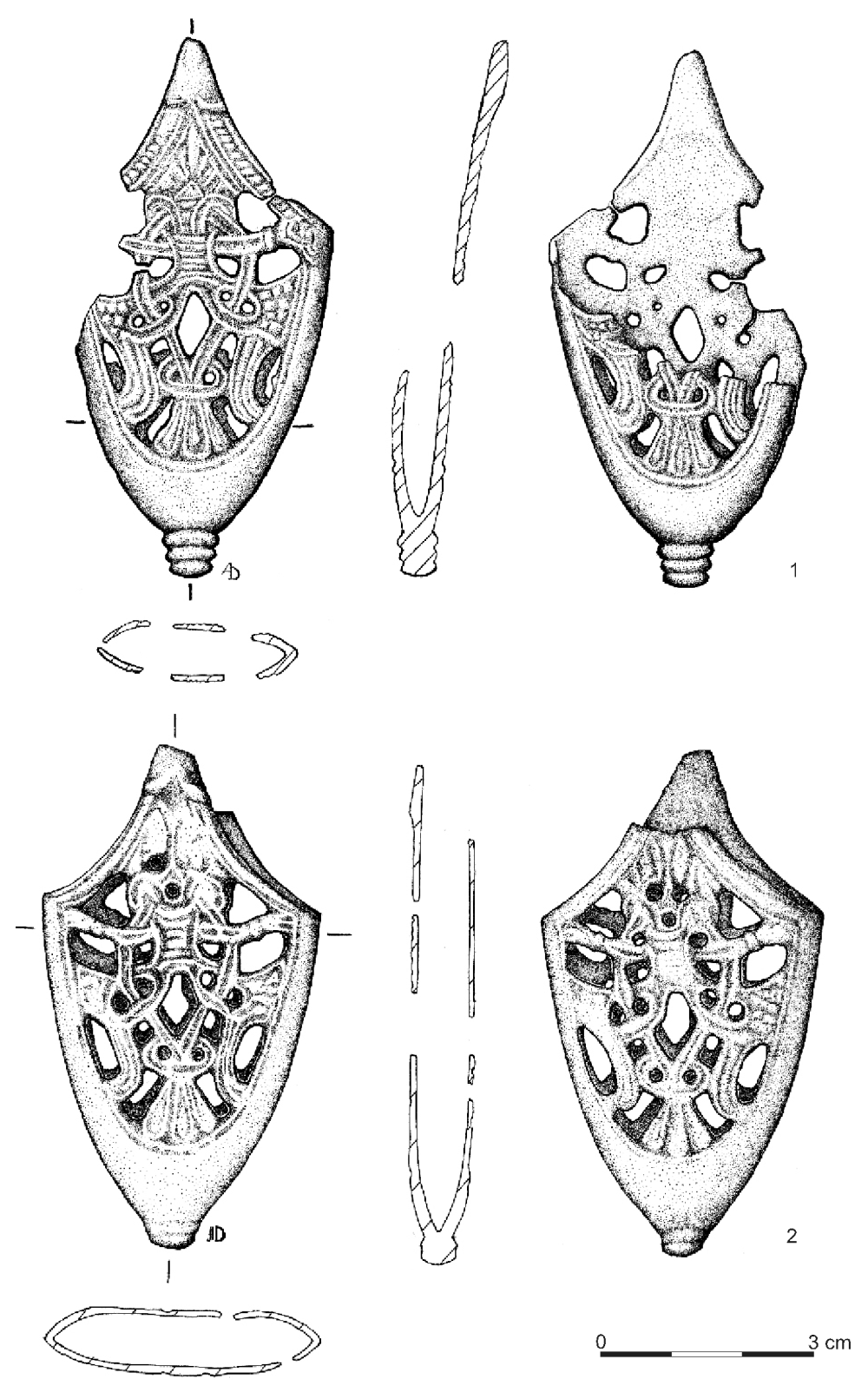 Несмотря на отмеченные выше общие признаки, которые объединяют их в один тип, некоторые орнаментальные детали позволяют говорить о вариантах орнаментации внутри этого типа наконечников.