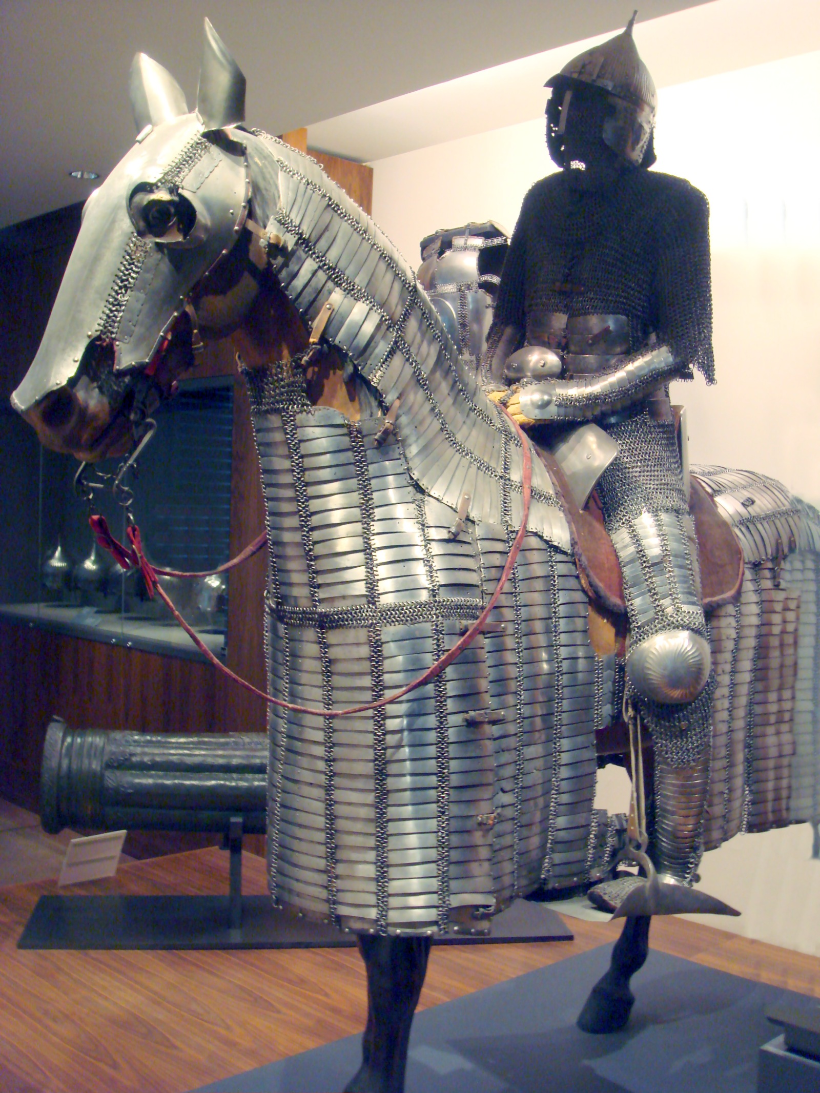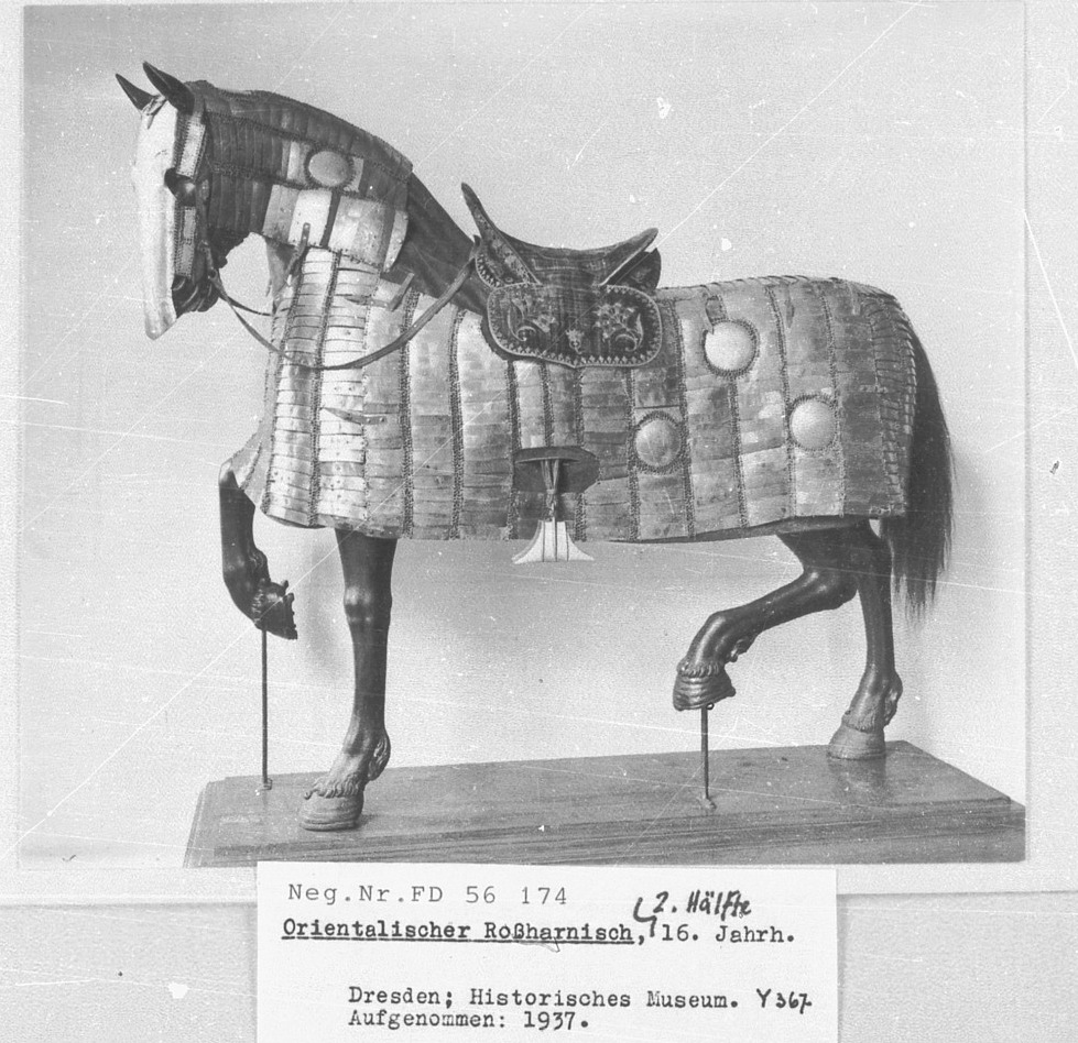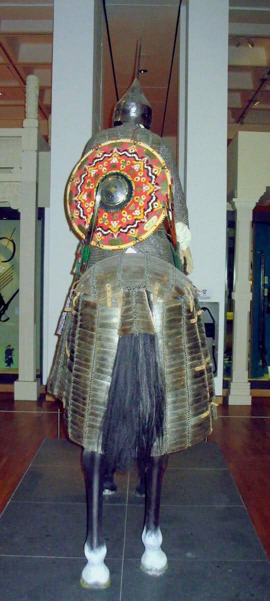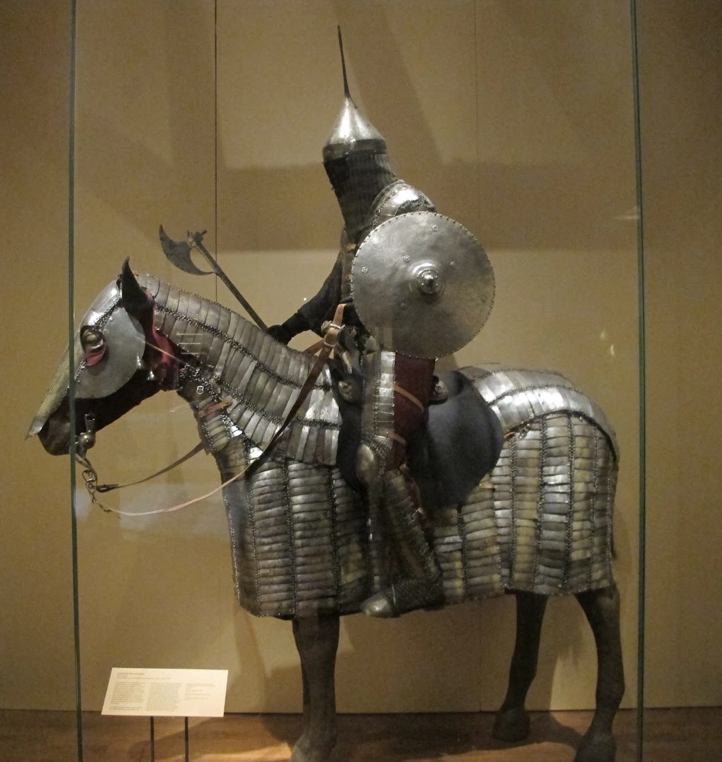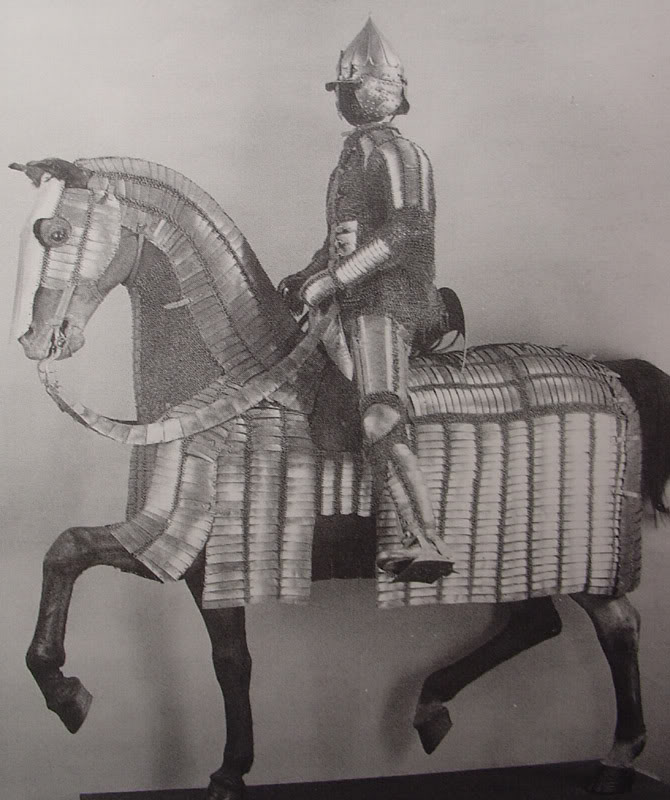 | Бронированый оттоманский всадник. Музей исламского искусства. Доха. Катар. | Всадник в доспехе и конь одоспешен. Очень интересный шлем. Берлинский Цейгхауз, фотография 1930 года. | Неподдельный интерес вызывают крайне редкие кольчато-пластинчатые штаны. Нац. Музея г. Будапешт |