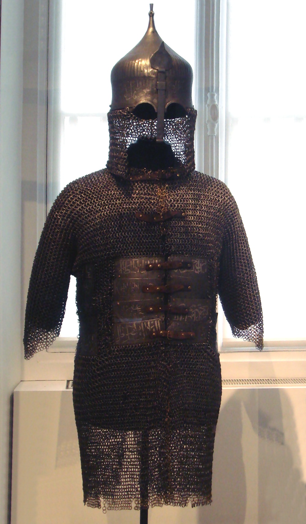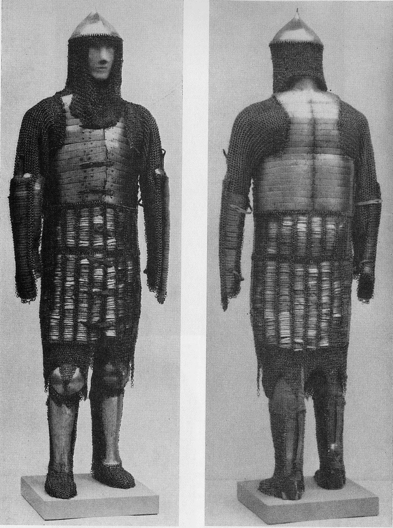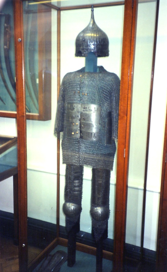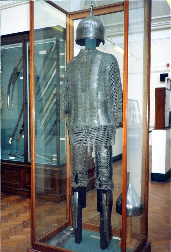 | Юшман египетских мамлюков конца 15-го века и тюрбанный шлем. | Кольчато-пластинчатый доспех с кольчато -пластинчатой защитой ног и тюрбанным шлемом. Victoria & Albert Museum, London | |