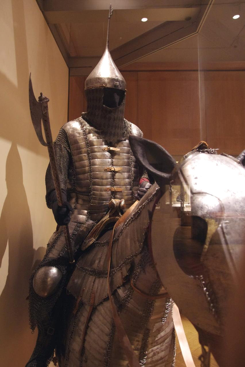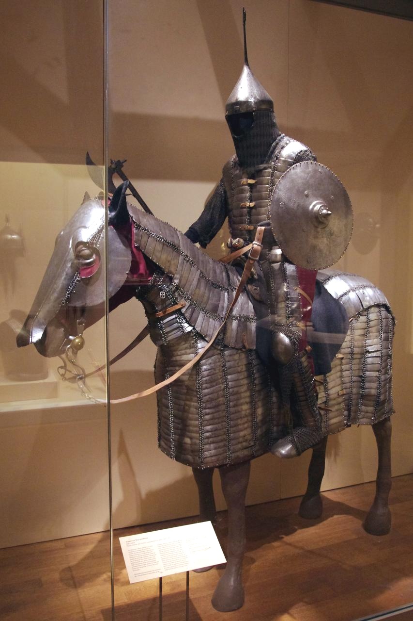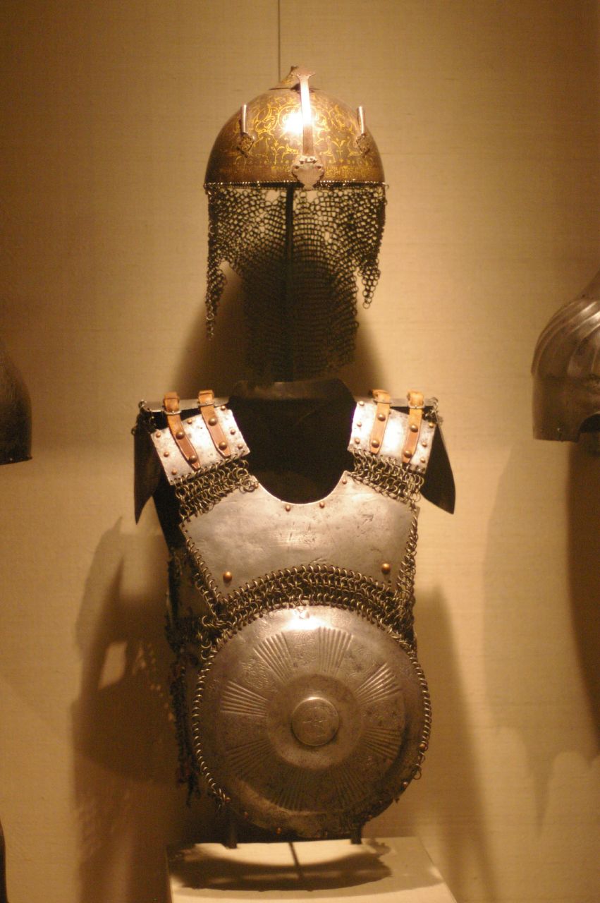 | Комплект турецкого вооружения и облачения включающий кольчато-пластинчатую защиту корпуса типа бехтерец, высокий конический шлем, полную защиту ног, бевую секиру, стальной щит, кольчато-пластинчатый доспех лошади с шамфроном, уздечку седло, стремена. Метрополитен Музей в Нью Йорке. США | ||