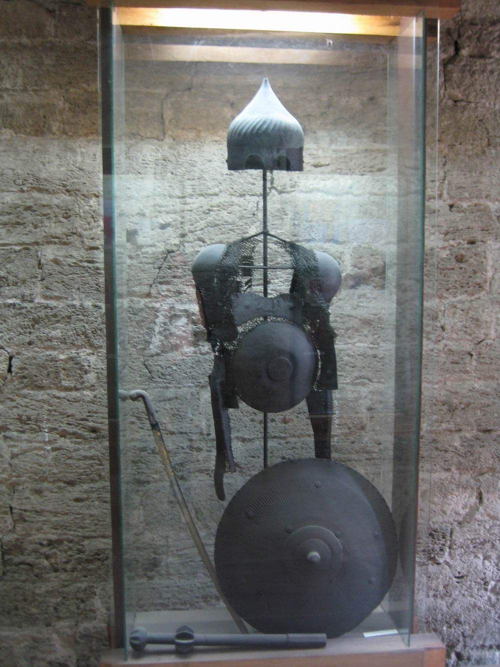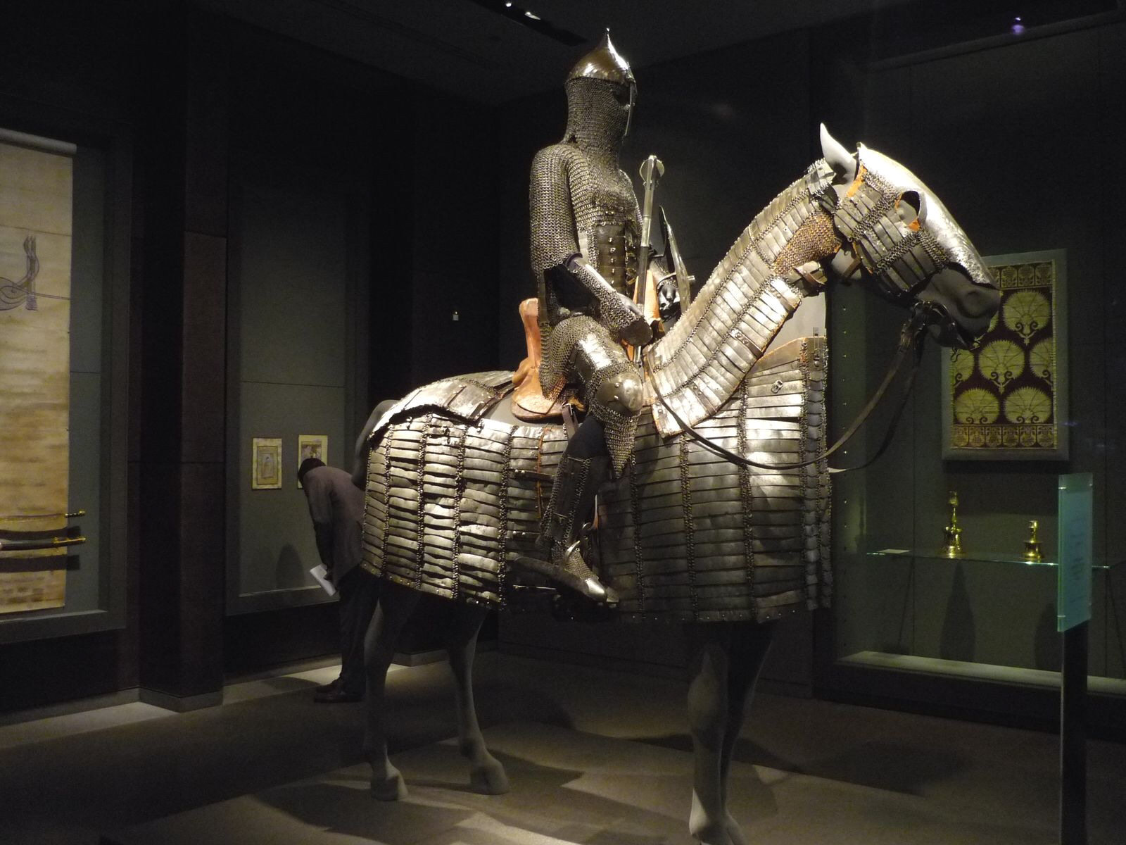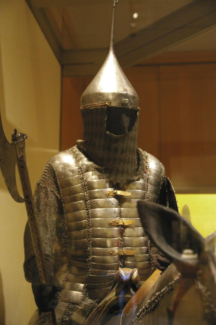 | Комплект турецкого вооружения и облачения включающий кольчато-пластинчатую защиту корпуса типа бехтерец, высокий конический шлем, полную защиту ног, бевую секиру, стальной щит, кольчато-пластинчатый доспех лошади с шамфроном, уздечку седло, стремена. Метрополитен Музей в Нью Йорке. США | ||