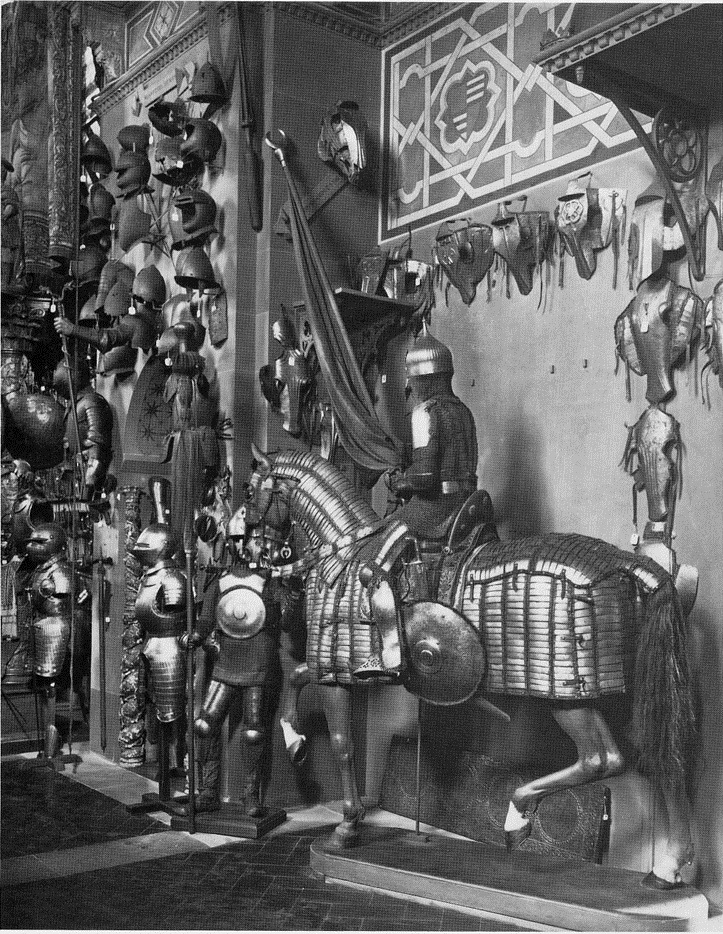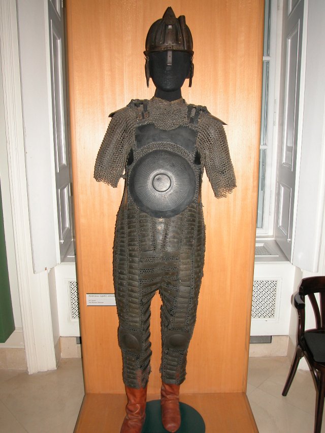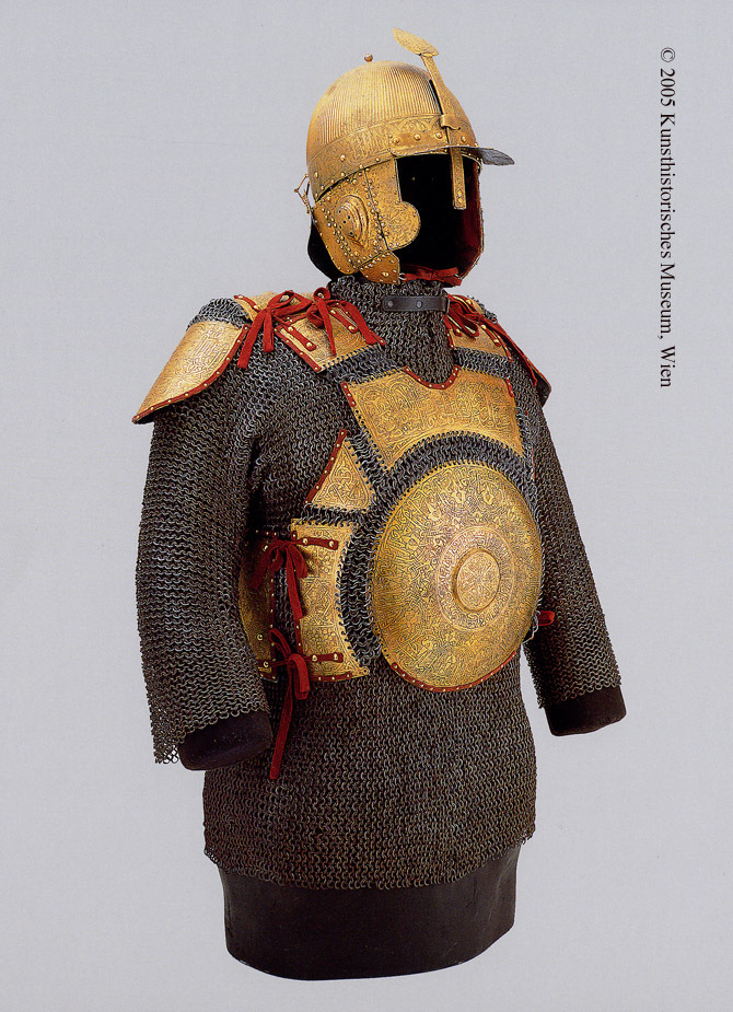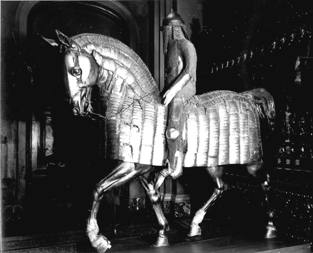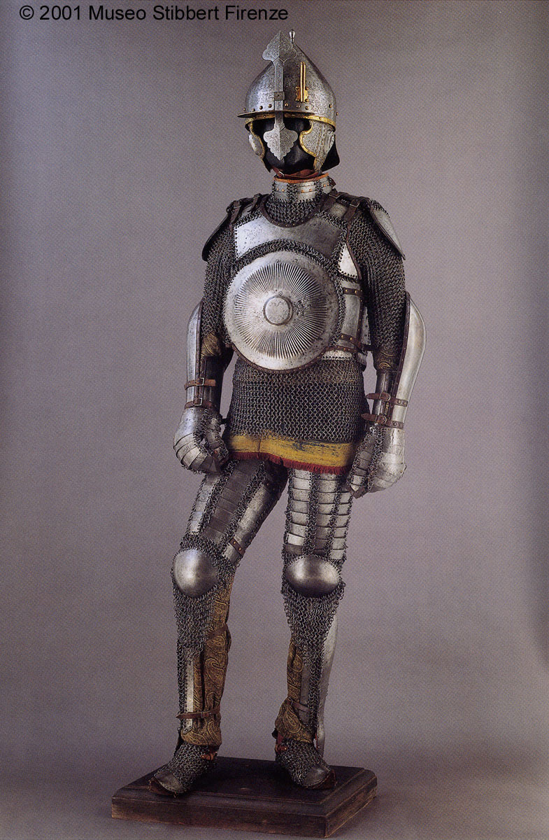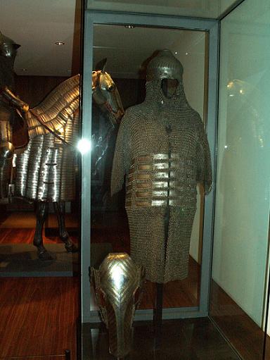 | Кольчато-пластинчатый доспех и шлем. Королевские арсеналы в Лидсе. | Комплект ис позолоченного зерцала и шлема и вороненной кольчуги с длинными рукавами. Исторический музей Вены. Автрия. | Кольчато-пластинчастый доспех коня и набор прочего снаряжения коня. Исторический музей Дрездена. Германия. |