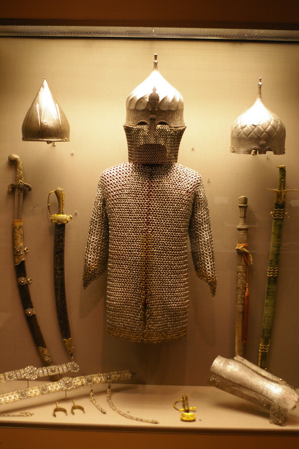| Тюрбанный шлем, юшман, без нахлеста пластин, лошадиная броня на лоб - шамфрон. Musée de l'Armée, Paris. | Персидские доспехи: тюрбанный шлем и кольчуга байдана. Philadelphia museum of Art | Комплект оружия и доспехов. Коллекция Хиггинса (The Higgins Armory) |