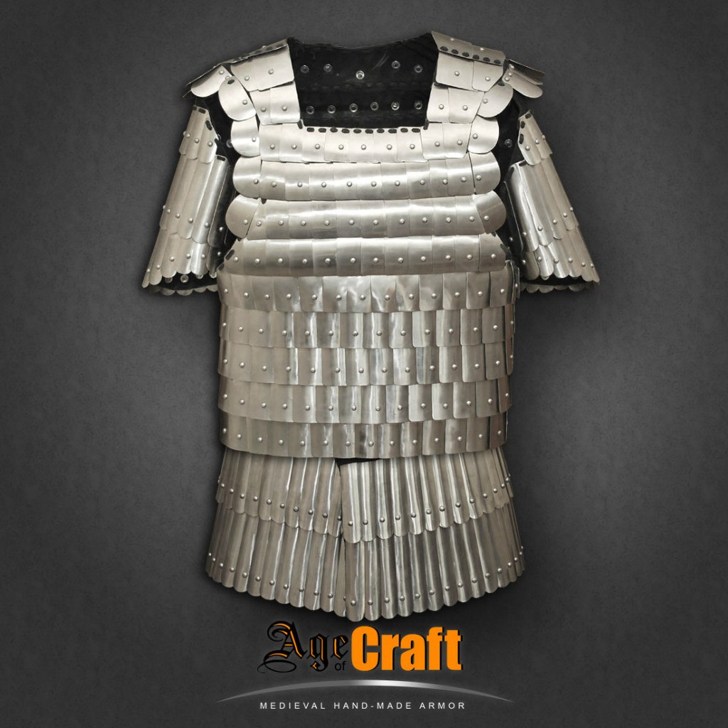 Клепано-пришивная чешуя с пологами была широко распространена в русском защитном комплексе XIII-XIV вв. Это доспех из пластин, собраных на кожаной основе. Пластины доспеха пришиваются к основе через 3-6 отверстий в верхнем краю и закрепляются в центре одной-двумя заклепками. Вес зависит от толщины чешуек.