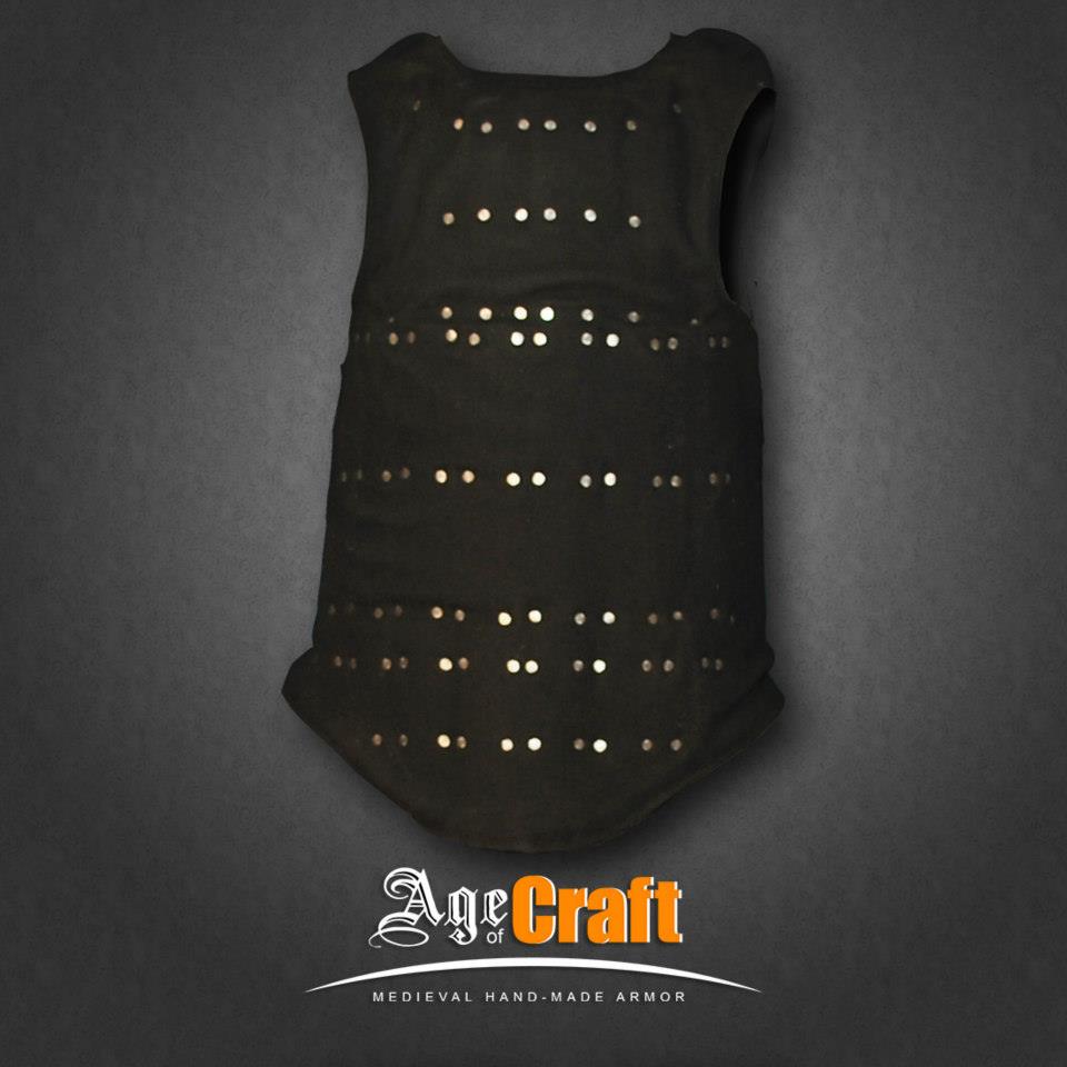 Бригантный доспех на основе корпуса Висби тип 12. Также к нему добавлены шинно-бригантные оплечья, наручи и набедренники. Данный доспех характерен для западноевропейского рыцаря второй половины 14 века. Представляет собой платинчатую броню присединенную при помощи заклепок к тканевой основе. Жупон для корпуса и защита конечностей шиты вручную из нескольких слоев высококачественной ткани, заклепки для крепления пластин кованы вручную. Пластины защищены от ржавчины лужением.