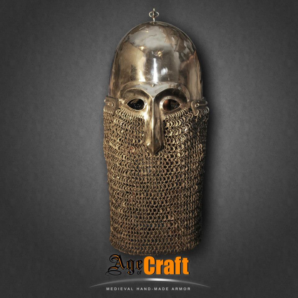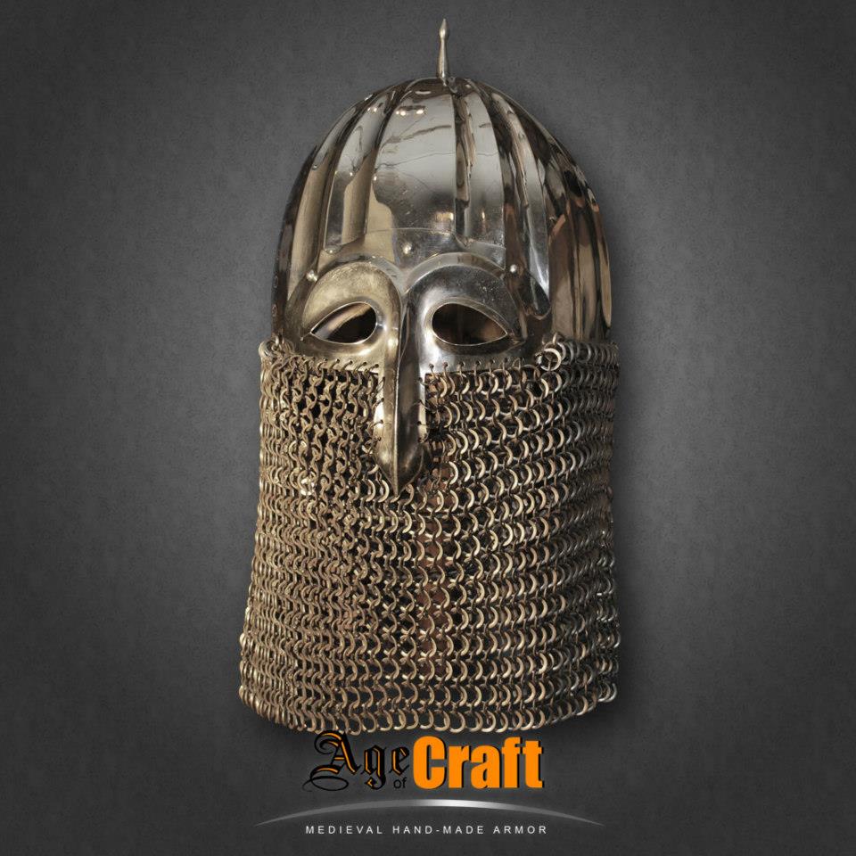 Этот шлем подходит для реконструкции древнерусского дружинника 13 века так и для ближневосточного воина. По типологии А. Кирпичникова он относится к типу IV. Характеризуется куртобокой сфероконической тульей, которую венчает коротенький шпиль с кольцом и полумаской имитирующей глаза и клюв хищной птицы. Героев былин и сказок сравнивают с орлами и соколами, а мудрость ассоциируют с совой.
