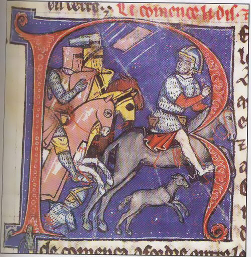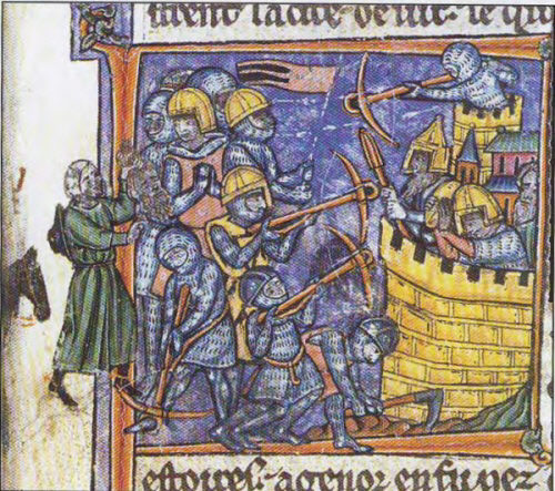 Очень похожи на вышеуказанные шлемы из Кайруана и Пэвенси три изображения боевых оголовий на миниатюрах в западной хронике эпохи Крестовых походов – «Истории Святой Земли» Гильома Тирского (Histoire d’Outremer, William of Tyre). Это произведение было написано во Франции, и его оформление закончено к 1261 г. На всех миниатюрах, нарисованных к «Истории» четко и детально, с характерной для западной изобразительной традиции того времени, показано сружение воинов как Запада, так и Востока. Из чего следует, что создатели манускрипта были очень хорошо знакомы с реалиями противоборствующих сторон середины XIII столетия. Так, на одной из миниатюр подобный шлем можно видеть на султане Дамаска – Нурредине, бегущем от воинов-крестоносцев (рис. 10,1). А еще два подобных шлема изображены в сюжете осады города Гира (рис. 10,2). Причем один из них надет на голову мусульманского воина, другой – на голову «франка». Следовательно, можно предположить, что некоторые формы восточных боевых оголовий могли носить воины Запада. Данный тезис подтверждает и археологическая находка из Англии, так как для Западной Европы XIII -начала XIV века подобная форма шлемов не характерна, "сходя из вышесказанного констатируем, что находка из Старых Орхей формой и технологией аналогична экземпляру из Кайруана, а следовательно, имеет ближневосточное происхождение и ится ко 2-й половине XIII века. В Восточную Европу шлем, скорее всего, попал в ходе одной из поставок предметов вооружения из Египта в Золотую Орду.